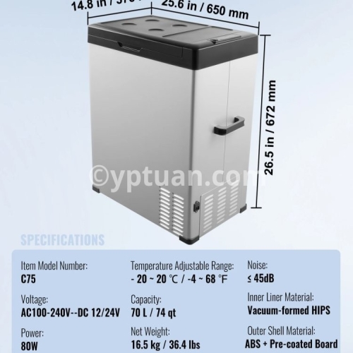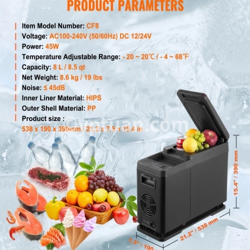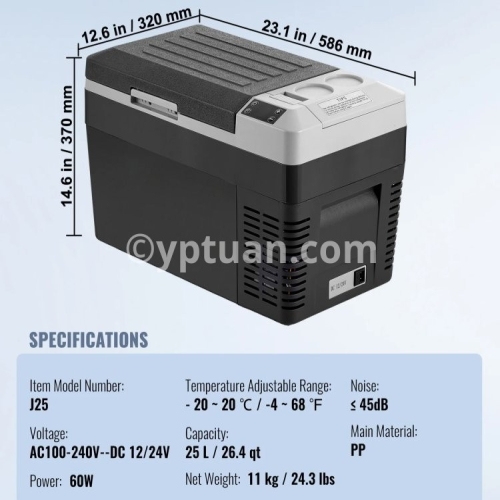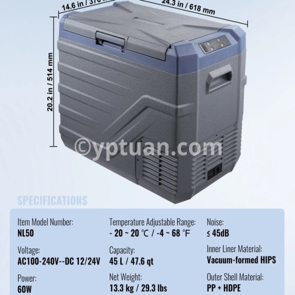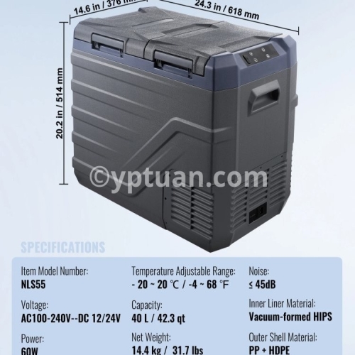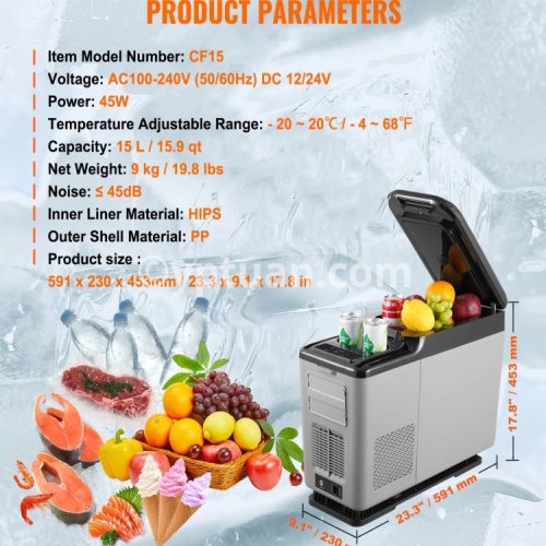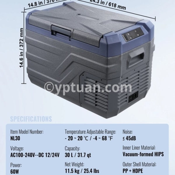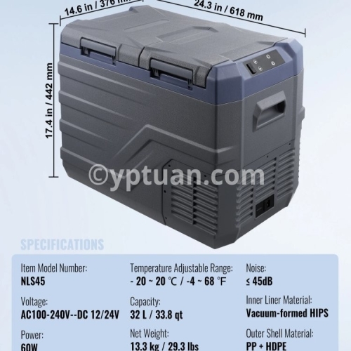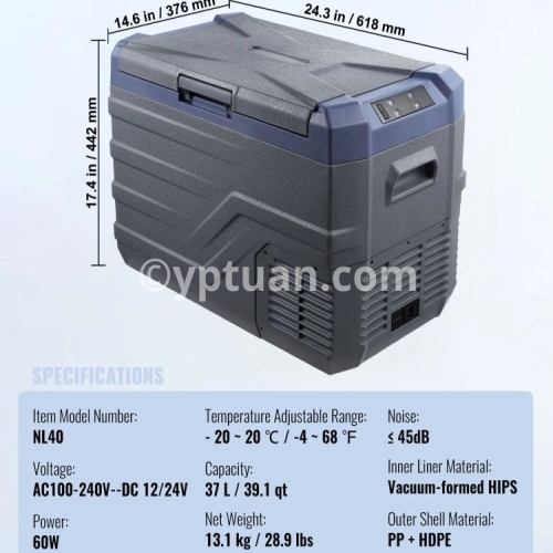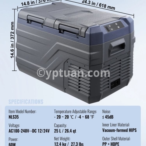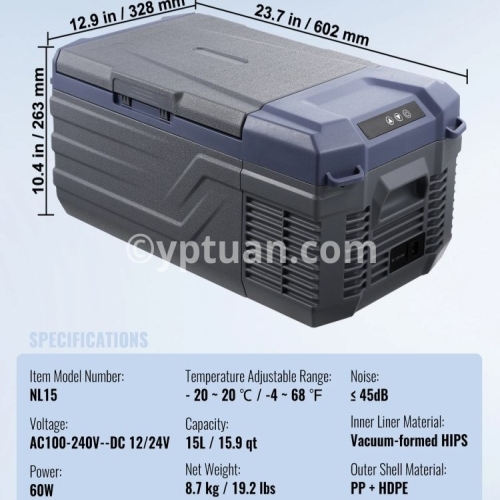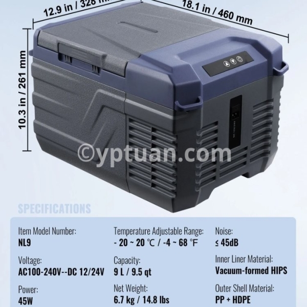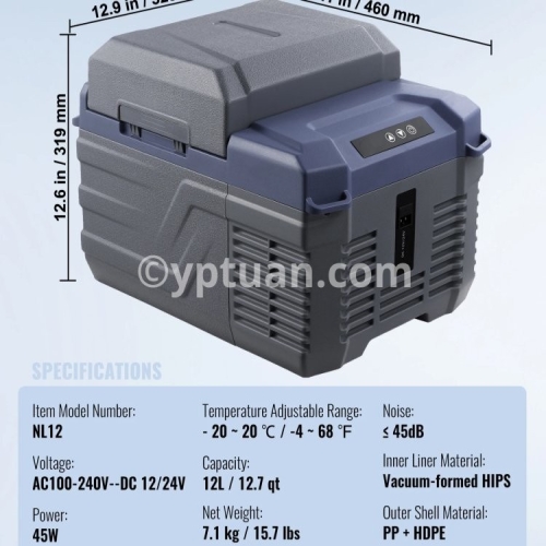 Item Model Number: NL12 Capacity: 12 L / 12.7 qt Net Weight: 7.1 kg / 15.7 lbs Product Size: 460 x 328 x 319mm / 18.1 x 12.9 x 12.6 in Temperature Adjustable Range: - 20 ~ 20 ℃ / -4 ~ 68 ℉ Voltage: AC100-240V (50/60Hz) DC 12/24V Power: 45W Noise: ≤ 45dB Inner Liner Material: Vacuum-formed HIPS Outer Shell Material: PP + HDPE/li>