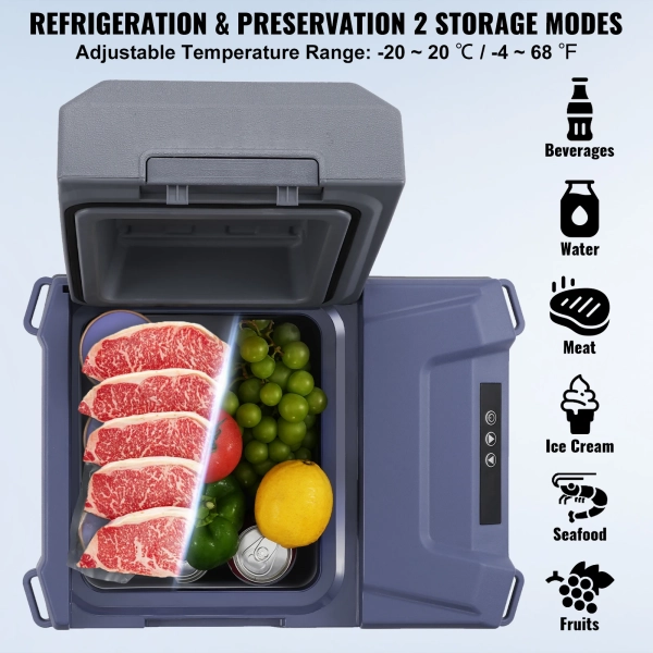 This 12 L car refrigerator features an upgraded compressor for rapid cooling within 1 hour. It can store at different temperatures and operates well between 16 ~ 38 ℃ / 60.8 ~ 100.4 ℉. It offers large capacity, rapid cooling, LED screen and Bluetooth control, is quiet and energy efficient, and is suitable for both home and car use.