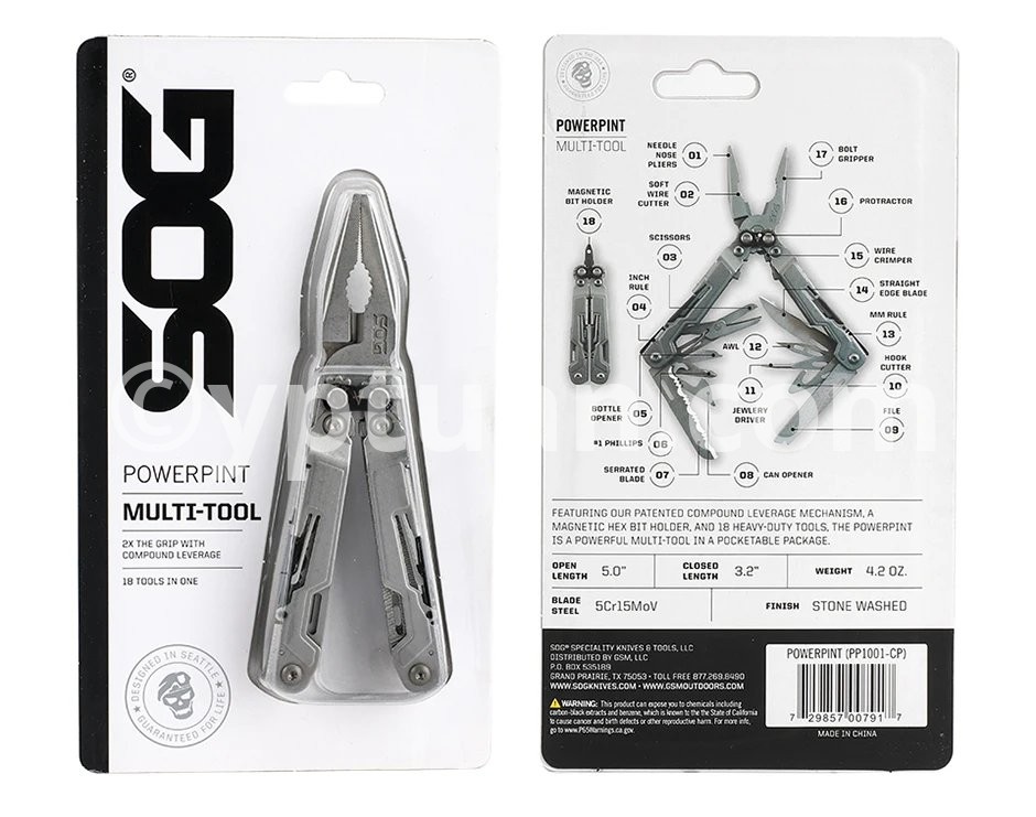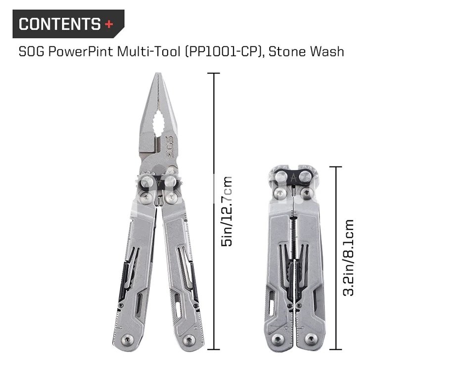 The PowerPint is a mini multi-tool with that delivers full-sized utility. The Pint comes equipped with 18 tools and a magnetic hex bit holder. And of-course it features SOG's Compound Leverage that provides smooth open and close and increased gripping power. At only 5" long and a lightweight 4.2 ounces, the PowerPint is an all-around multi-tool that's great in your pocket, your pack, on the tool bench, or around the house. Also available in a black coating. Item PP1001-CP