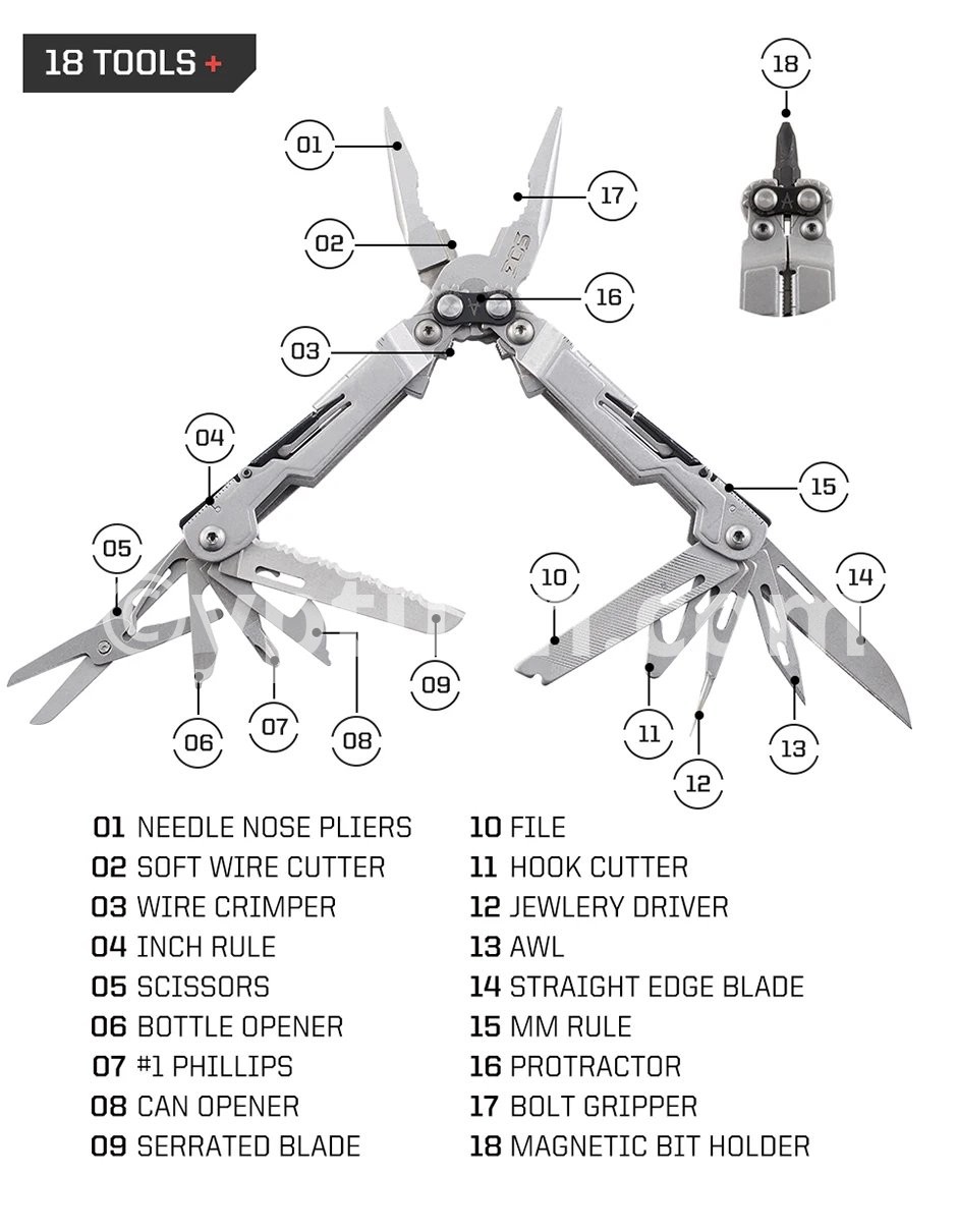 PRODUCT WEIGHT:4.2oz/120g UPC:729857007917 PREORDER DATE:N/A IS PREORDER:N/A DISCONTINUED PRODUCT:N/A PRODUCT TYPE:Multi-Tool COUNTRY OF ORIGIN:China FINISH:Stone Wash TOOL COUNT:18 PACKAGING:Trap Blister BLADE STEEL TYPE:Stainless Steel 3-SIDED FILE:Yes AWL:Yes BOTTLE OPENER:Yes CAN OPENER:Yes FULL SERRATED BLADE:Yes GRIPPER:Yes HARD WIRE CUTTER:Yes NEEDLE NOSE PLIERS:Yes PHILIPS SCREWDRIVER:Yes PROTRACTOR:Yes RULER:Yes SCISSORS:Yes SMALL FLAT SCREWDRIVER:Yes STRAIGHT EDGE BLADE:Yes LINE CUTTER:Yes JEWELRY DRIVER:Yes SOFT WIRE CUTTER:Yes MAGNETIC HEX BIT DRIVER:Yes