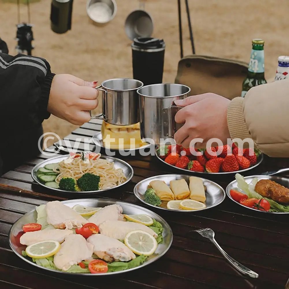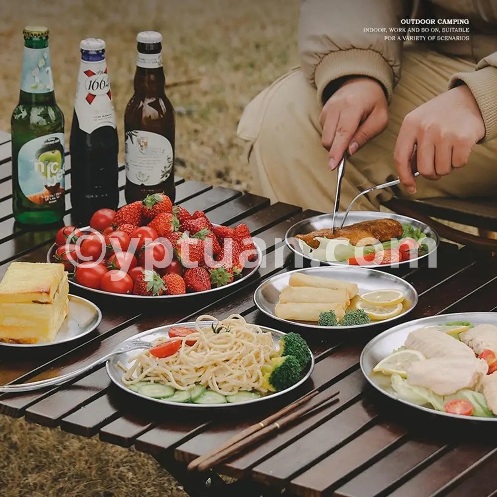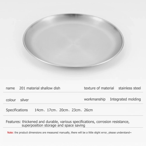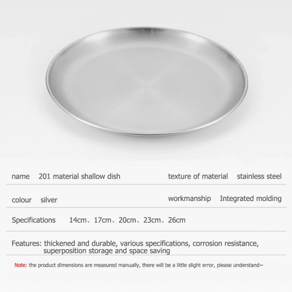 Stainless Steel Plates Camping Plates Reusable Metal Dinner Dishes Portable Feeding Serving Tableware for Outdoor Camping Picnic Feature: 1. and Sturdy Construction: The stainless steel plates are crafted with a solid one-piece design, using high-quality stainless steel material. This ensures exceptional durability and sturdiness, allowing them to withstand daily use and last for a long time. 2. Enhanced Safety with Rolled Edges: The camping plates feature a thoughtful rolled edge design, which provides an added layer of safety during use. The rounded edges prevent any potential injuries or accidents, making them a reliable choice for outdoor activities. 3. Space-Saving with Stackable Design: The dinner plates are designed to be stackable, allowing for efficient use of storage space. Whether you have limited cabinet space or need to transport them during camping trips, the ability to stack the plates helps save valuable space while ensuring easy access whenever needed. 4. Easy to Clean and Convenient: The metal dinner dishes are easy to clean and maintain. They are resistant to stains and odors, and can be effortlessly washed by hand or in a dishwasher. This convenience adds to their practicality and suitability for everyday use. 5. Versatile Options with Various Sizes: The round plates come in a wide range of sizes to cater to different dining needs. Whether you are serving a small snack or a hearty meal, you can choose the appropriate size of the plate to enhance the dining experience. The availability of multiple sizes ensures versatility and flexibility in meal presentation. Specification: Origin: Mainland China Material: Stainless Steel Diameter: 14cm, 17cm, 20cm, 23cm, 26cm Color: silver Process: One-piece moldingNote: Due to the different monitor and light effect, the actual color of the item might be slightly different from the color showed on the pictures. Thank you! Please allow 1-2cm measuring deviation due to manual measurement.