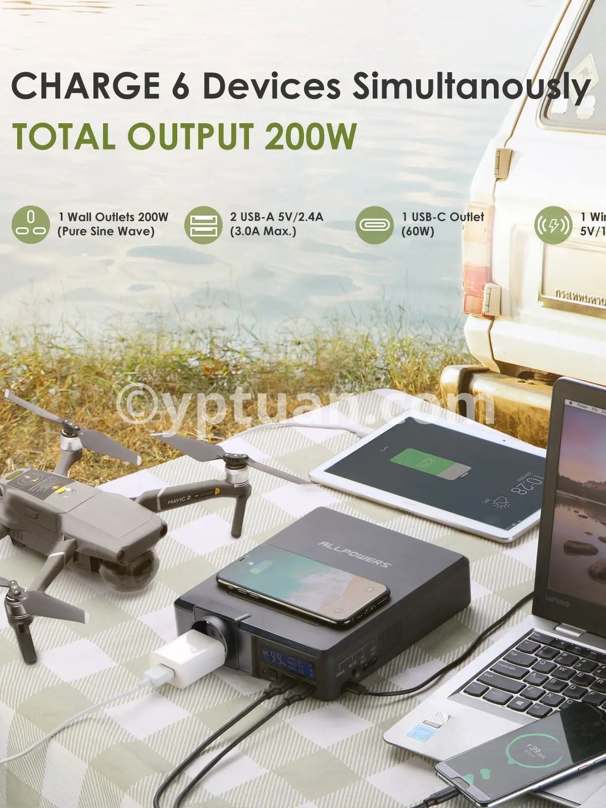 【18VDC+USB-C PD60W+USB-A*2 output, can power 4 devices at the same time.】