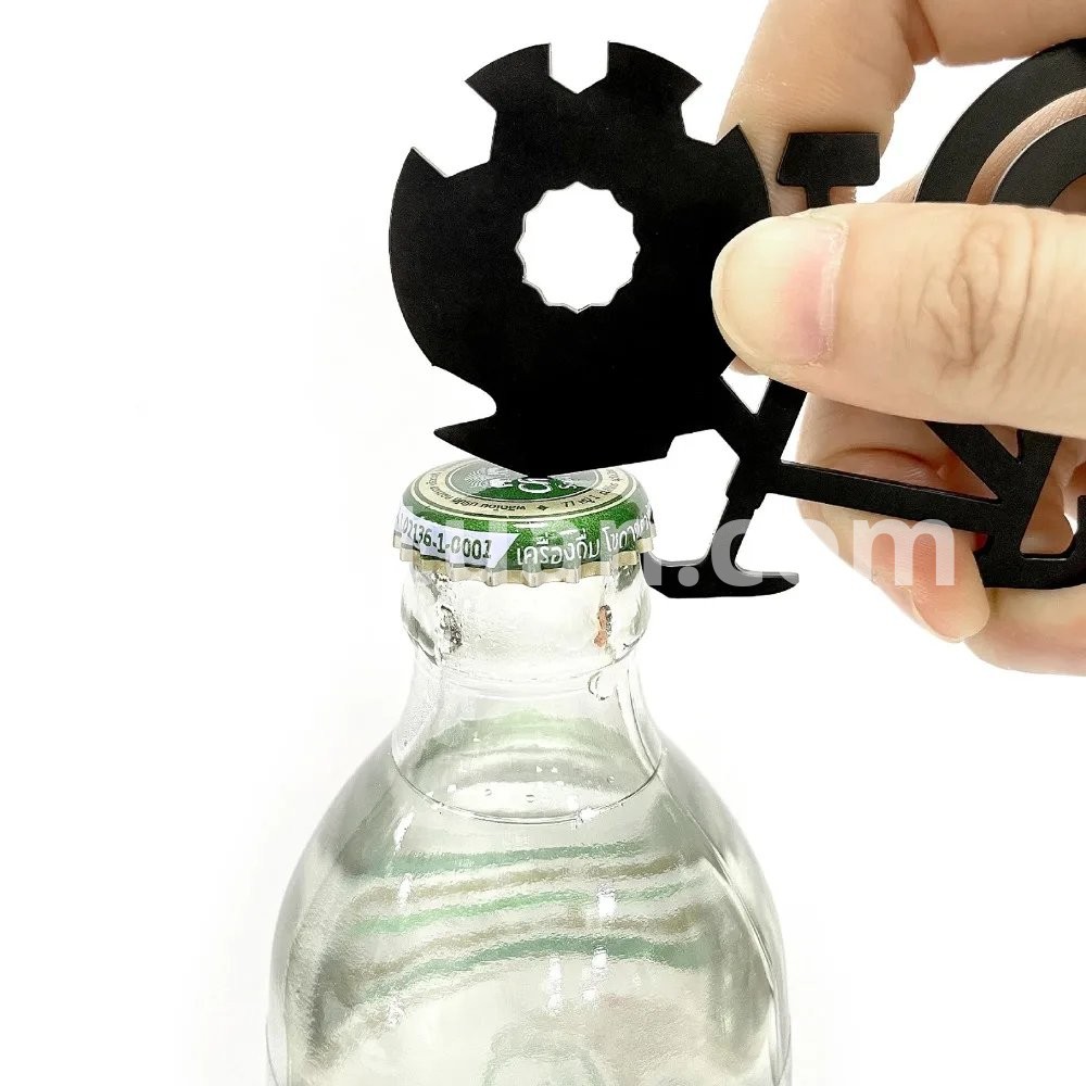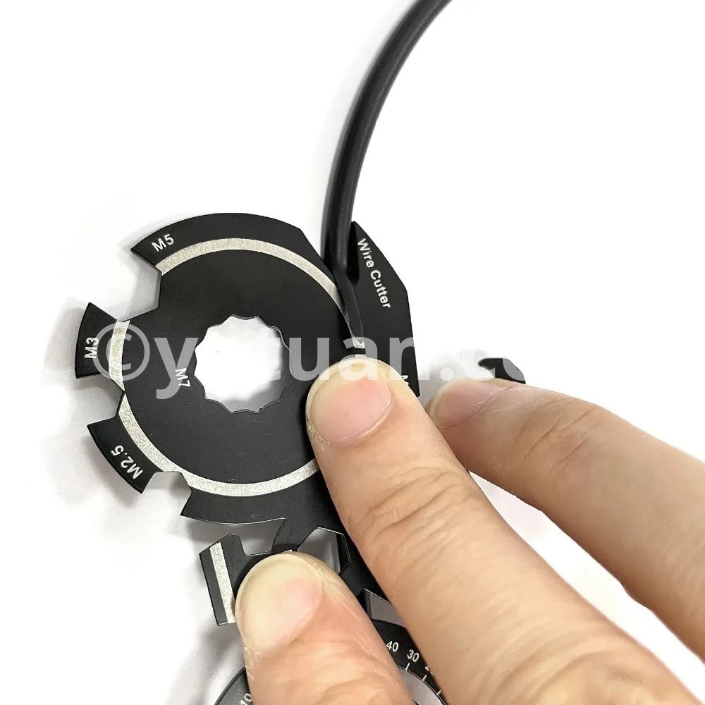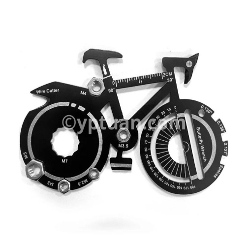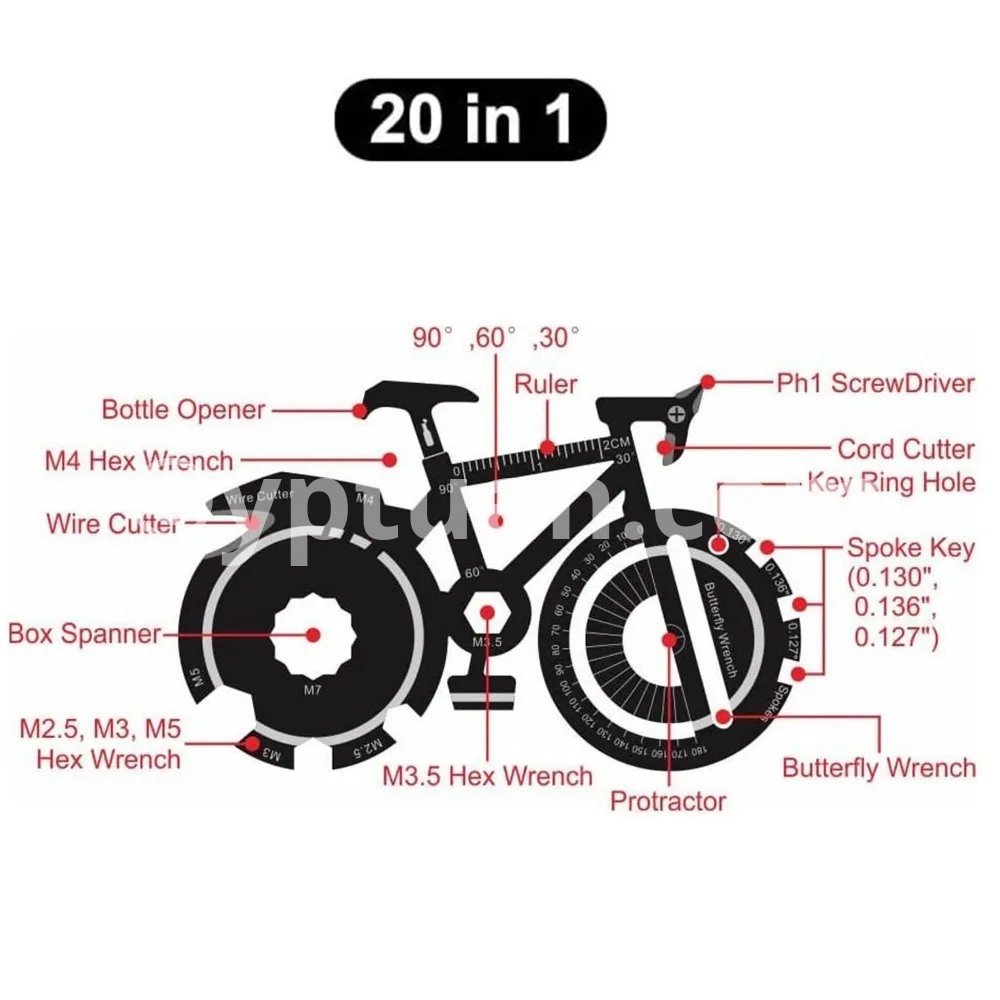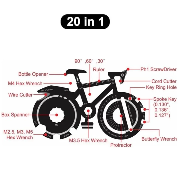 * Pocket-sized multitool contains 20 essential functions, including a bottle opener, screwdriver, bike spoke key, imperial and metric ruler, and more.