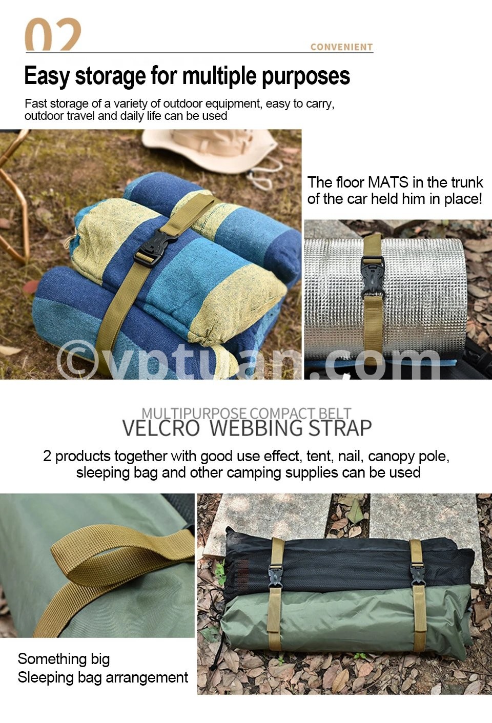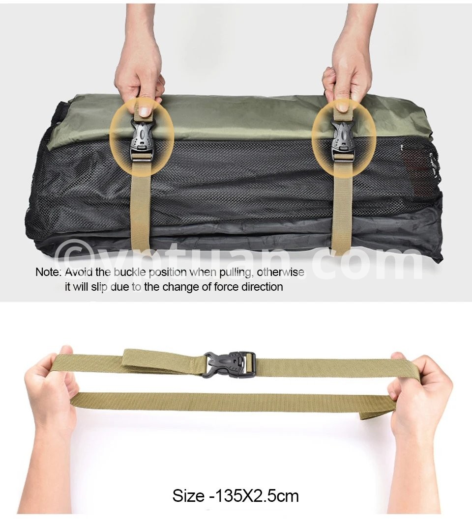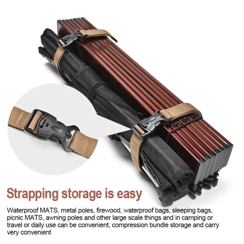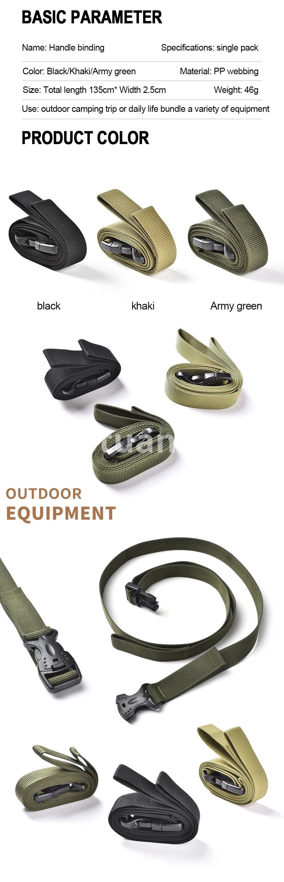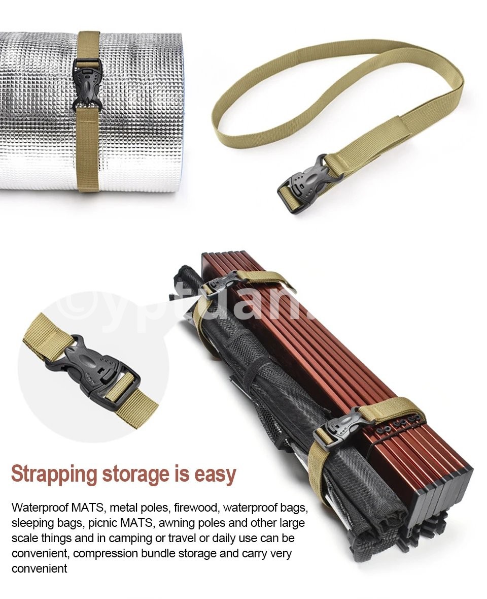 Feature: ▲Application: Bundle and store a variety of equipment in outdoor camping trips or daily life. ▲Adjustable length: humanized adjustable length design, foldable and easy to carry. ▲Multi-purpose, fast storage of various outdoor equipment, can be used for outdoor travel and daily life. ▲The two are used together for good results. Camping supplies such as canopies, ground nails, canopy poles, sleeping bags, etc. can be used. ▲Double insurance buckle-type binding belt to ensure safety, strong fixing force and sturdiness. It can store large-size moisture-proof mats, metal poles, firewood, waterproof bags, sleeping bags and picnic mats, canopy poles and other things, easy use and storage. Specification: Material: PP webbing Color: Black, Army Green, Khaki Total length: 135cm/53.15in Width: 2.5cm/0.98in Package include: 1 x Storage Belt