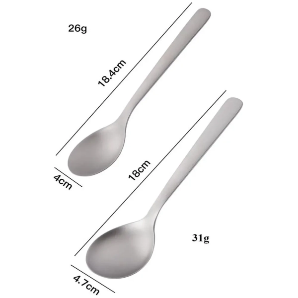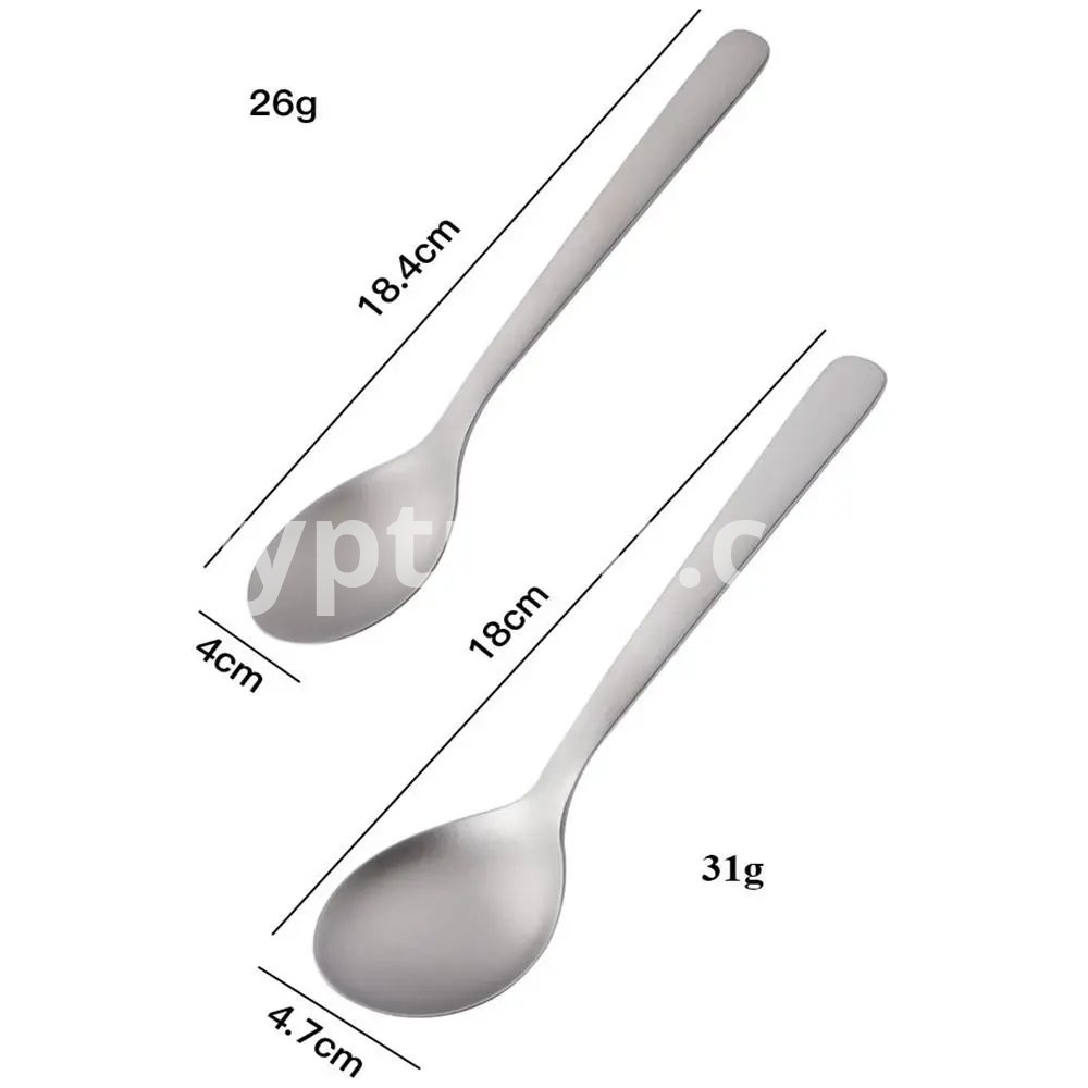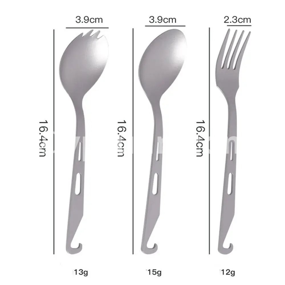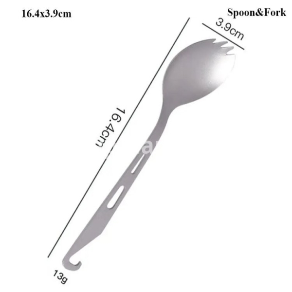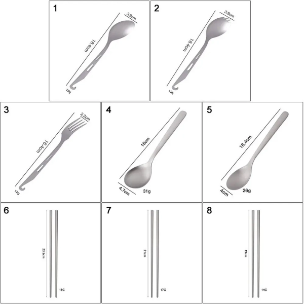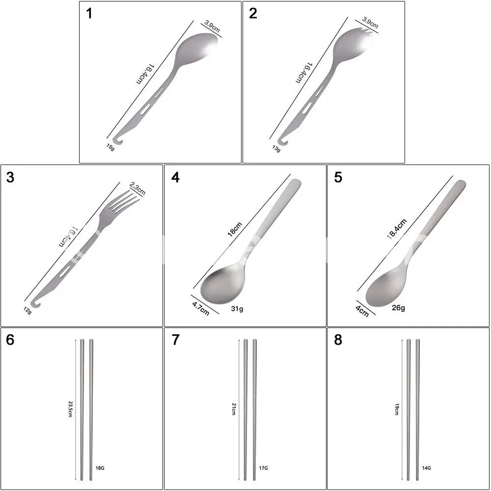 Brand new with high quality Type:Titanium Cookware Color:Silver Material:Titanium Quantity:1pc Length: Style 1:16.4*3.9cm/6.46*1.54in Style 2:16.4*3.9cm/6.46*1.54in Style 3:16.4*2.3cm/6.46*0.91in Style 4:18*4.7cm/7.09*1.84in Style 5:18.4*4cm/7.09*1.57in Style 6:23.5cm/9.25in Style 7:21cm/8.27in Style 8:19cm/7.48in Features: Lightweight, titanium construction. Features a long handle to reach the bottle corner easily. Polished bowl with flat head for smooth . A hole on the handle for convenient attachment to a key chain or carabiner. Package includes: 1pc Titanium Tableware Note: 1.1cm=10mm=0.39inch 2.Please allow 0-2cm error due to manual measurement. pls make sure you do not mind before you bid. 3.Due to the difference between different monitors, the picture may not reflect the actual color of the item. Thank you!