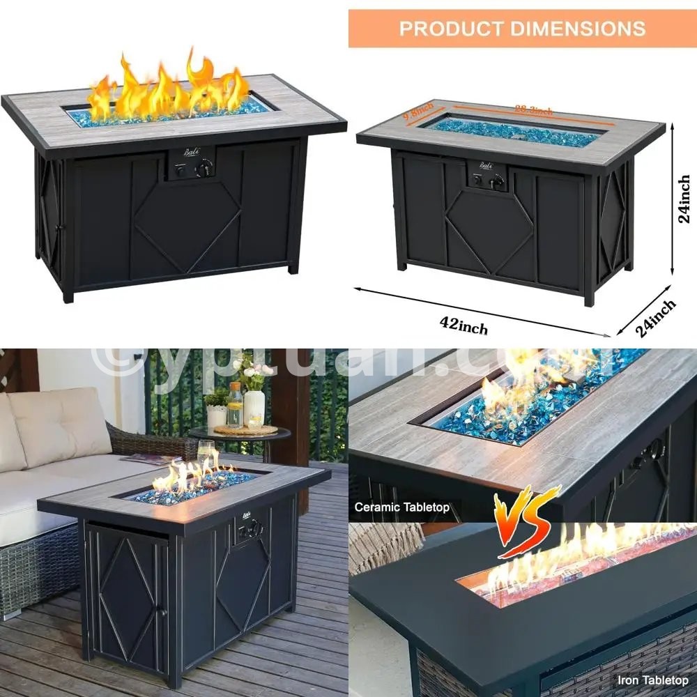 This 2-in-1 FireTable is a unique blend of a traditional fire pit and a practical table, featuring a beautiful ceramic tabletop with a steel wicker base that adds a decorative touch to any outdoor space. The 42-inch outdoor gas fire pit is made from a premium solid steel frame and stainless steel burner, ensuring durability and resistance to various weather conditions. The ceramic tabletop, with its natural lines, is sturdy and safe for placing food and drinks, and is easy to clean, complementing a variety of patio furniture and enhancing the elegance of your yard. The outdoor gas fire pit is CSA certified and can generate up to 60,000 BTUs, providing ample heat to keep everyone around the table warm. The Pulse ignition system makes it easy to ignite and adjust the flame to your desired level. The complete FireTable kit includes a cover lid and 15lb glass stones, creating a mesmerizing flame display that brightens your backyard and warms your heart. The table also features an internal 20-lb propane storage tank (propane not included). Measuring 42 inches in length, 24 inches in width, and 24.2 inches in height, and weighing 77.5 lbs, this gas FireTable is designed for convenience and enjoyment. Should you encounter any issues with your propane fire pit, our excellent after-sales service is just an email away, promising a solution within 24 hours. We also offer a 24-month warranty for your peace of mind.