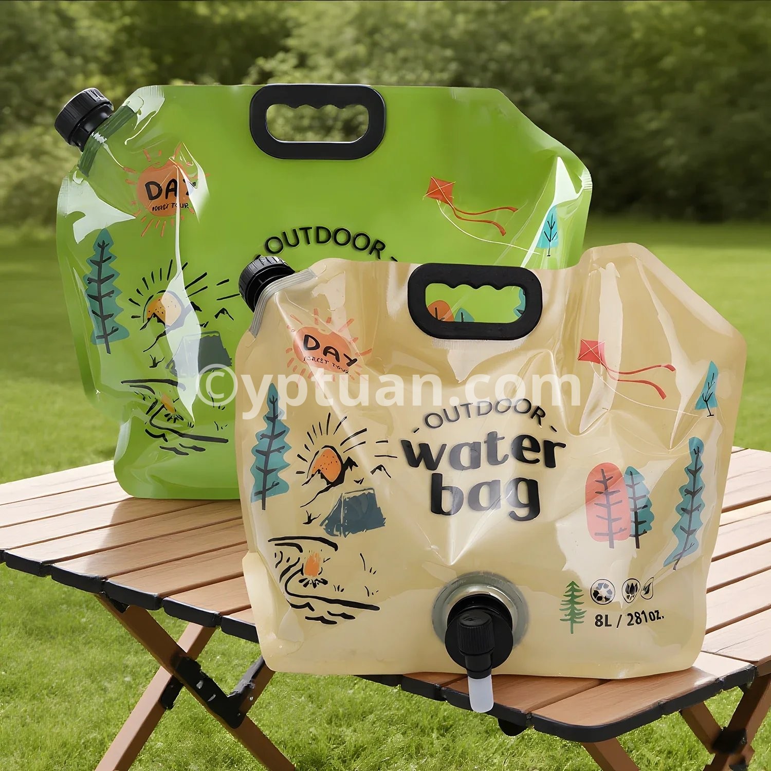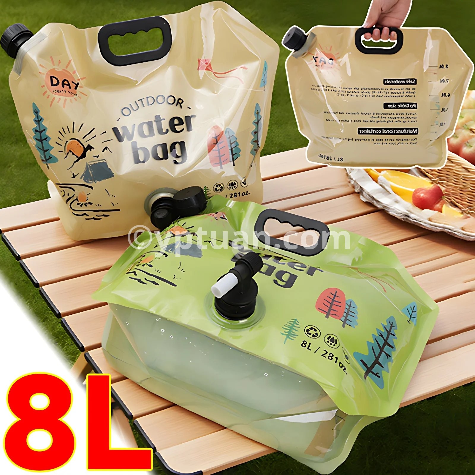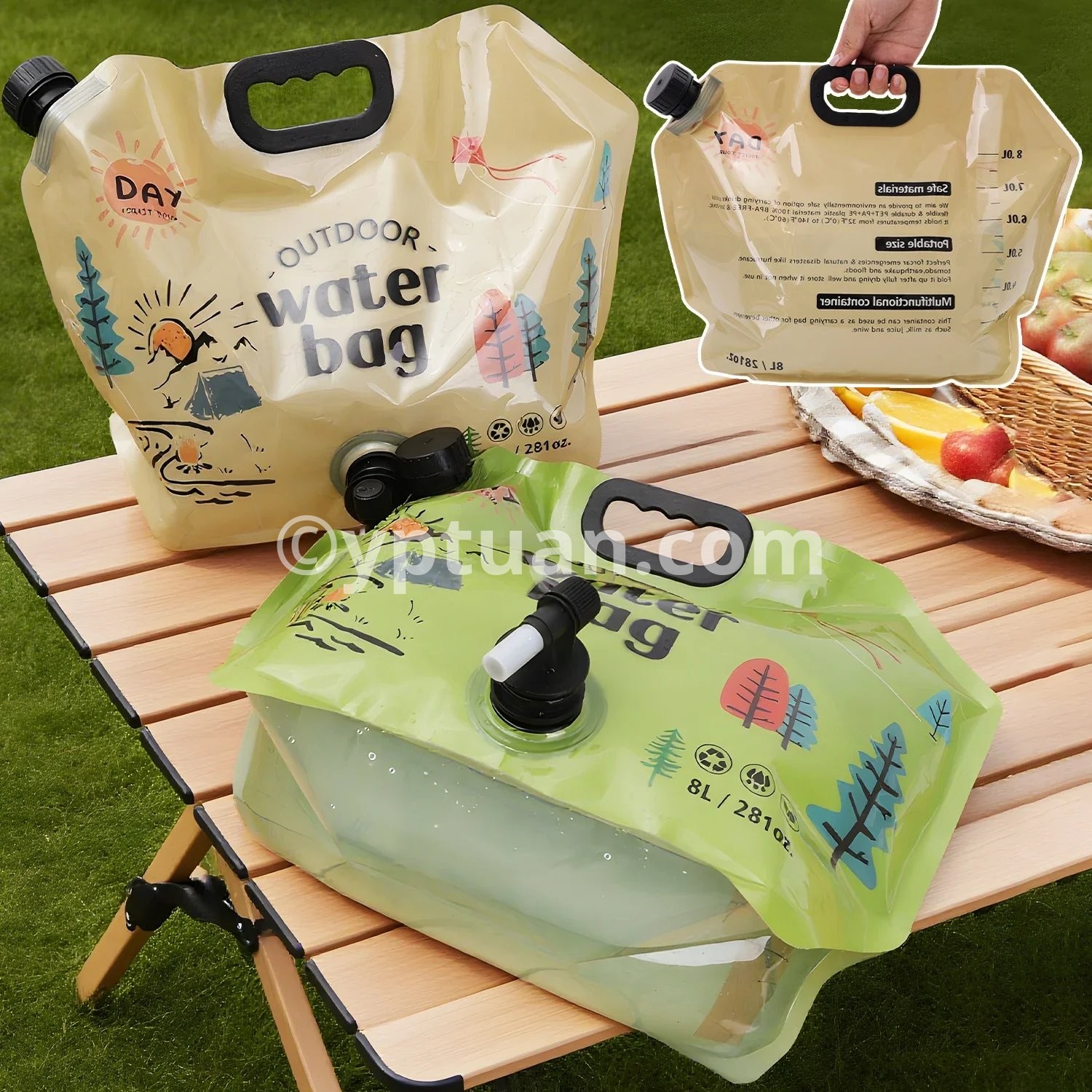 Specifications: A: Material: PET/PA/PE Size : 42*31.3cm B: Material: Plastic Color: Green, Khaki Size: Unfolded 42*7.5*31cm Packing size: 31*5*5cm C: Material: PVC size: 5L approximately 32.5*30.5cm 10L approximately 40.5*38cm Applicable: Outdoor camping and picnic scenes Package includes: 1* water storage bag