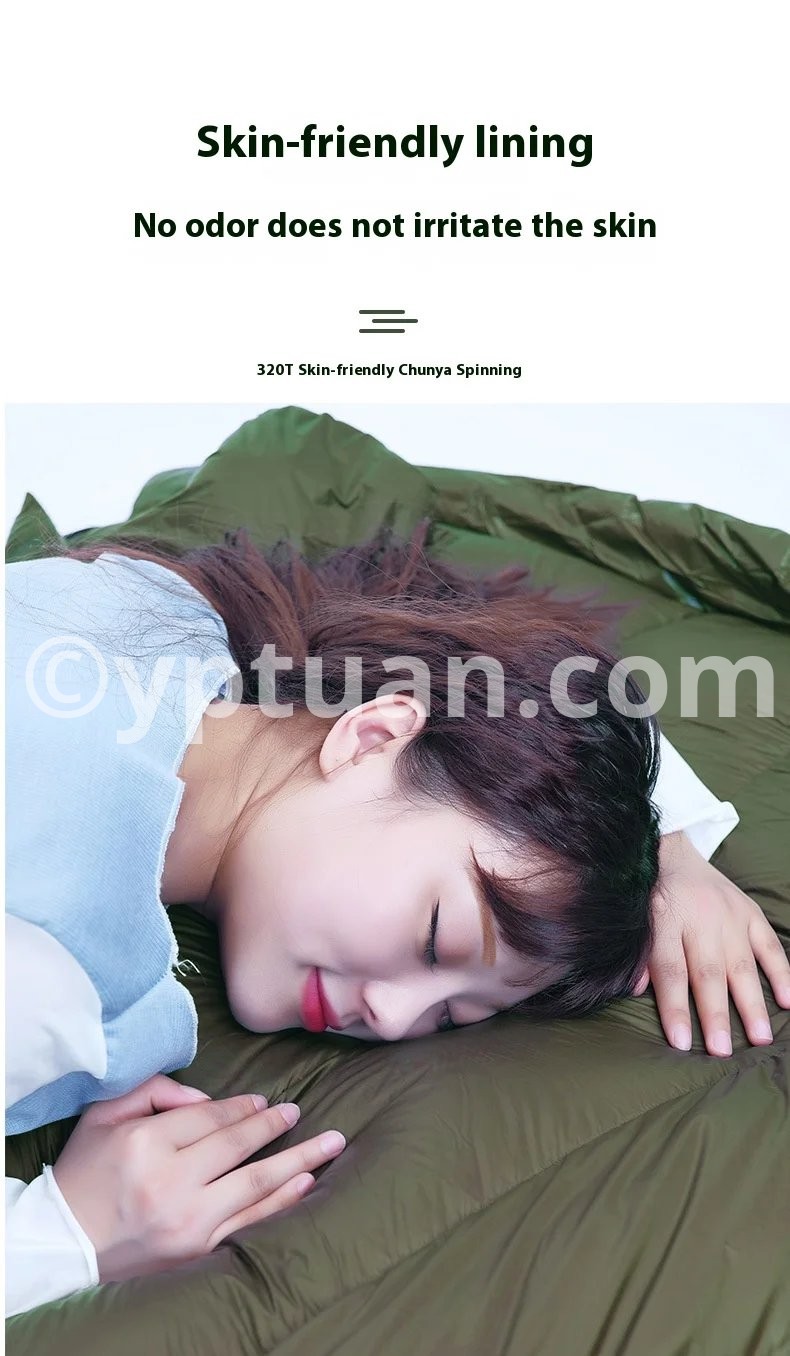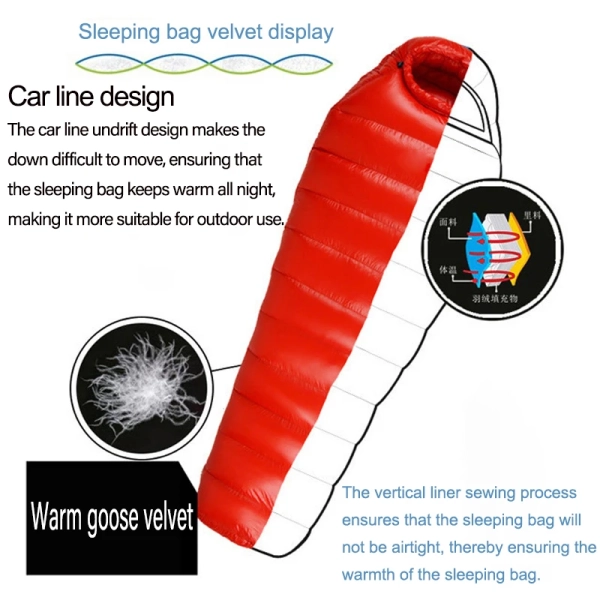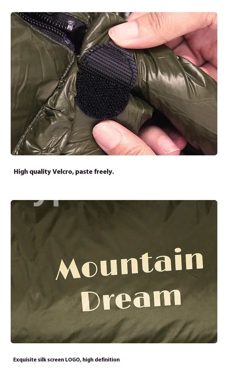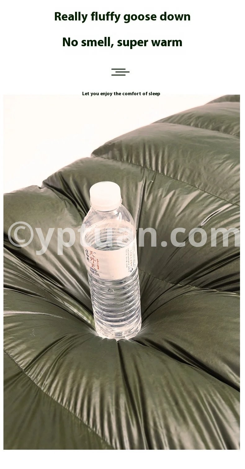 The sleeping bag adopts the vertical lining process, so that the goose down is evenly distributed, which increases the fluffy goose down and makes it more comfortable and warm.