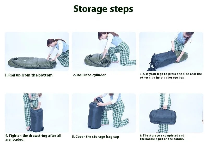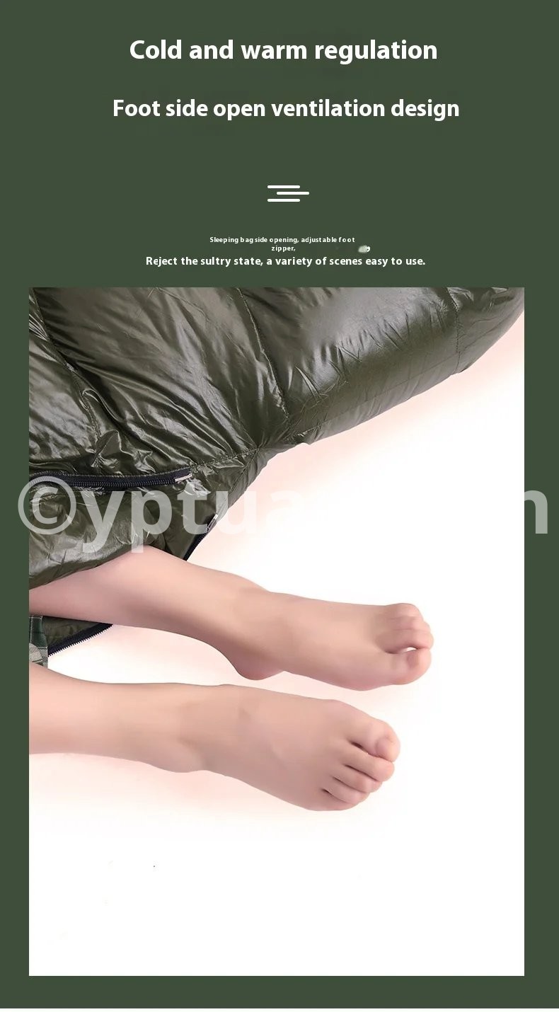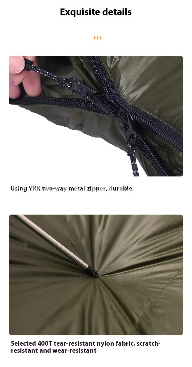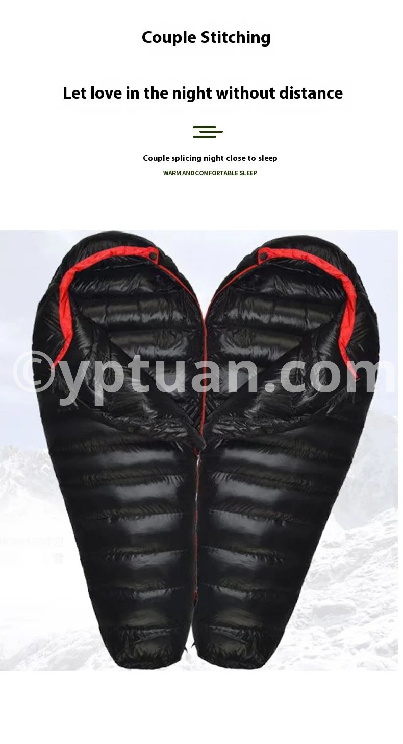 The sleeping bag adopts the vertical lining process, so that the goose down is evenly distributed, which increases the fluffy goose down and makes it more comfortable and warm.