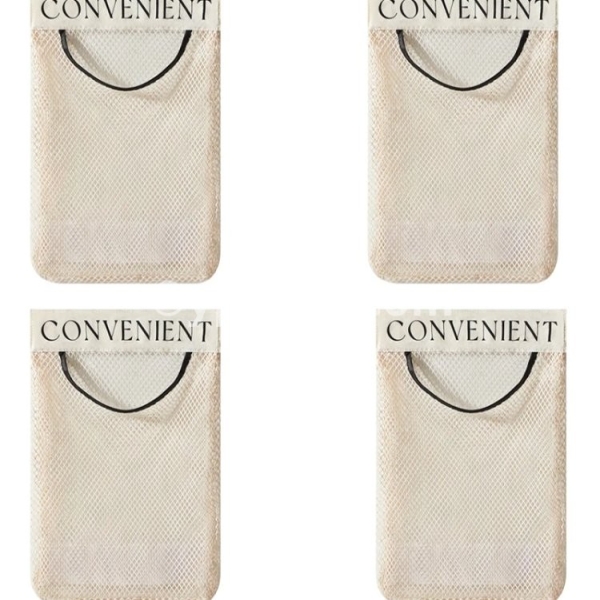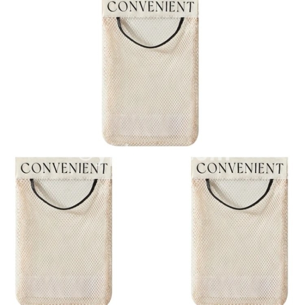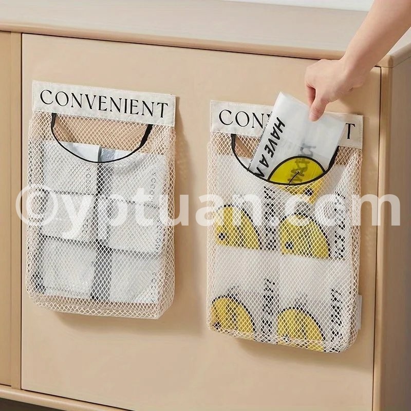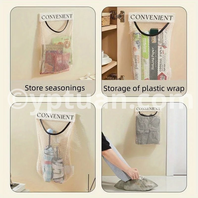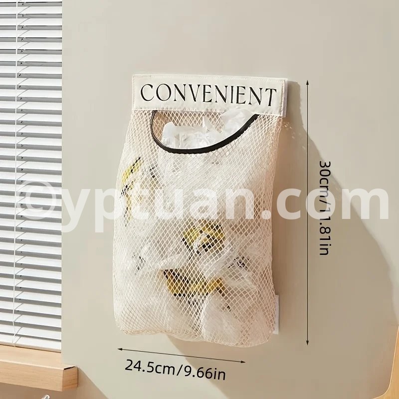 1.One bag is multi-purpose,simple and orderly.Large U-shaped opening for easy handling.Large capacity,accept all garbage bags. 2.Strong adhesive,earing no pressure.Detachable Velcro,take it at will. 3.Hollow mesh holes,fresh and breathable.High elastic mesh surface,pull without deformation.Visual grid,easy to find. Specification: Item:Storage bag Material:Terylene Color:Beige Note:Please allow a 1-2cm difference in measurements due to manual measuring.