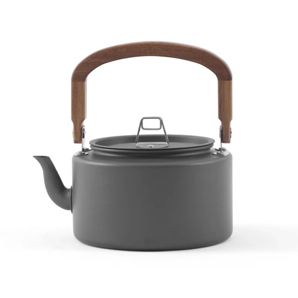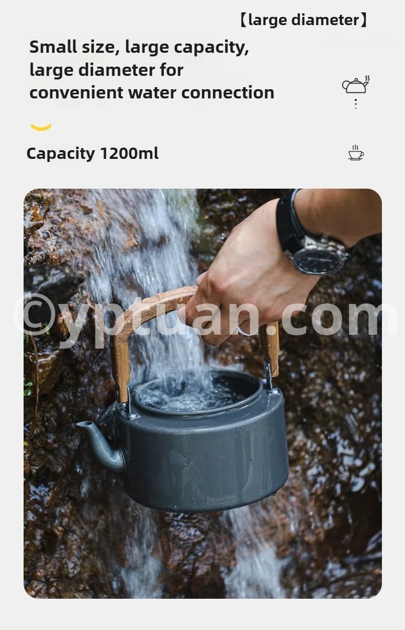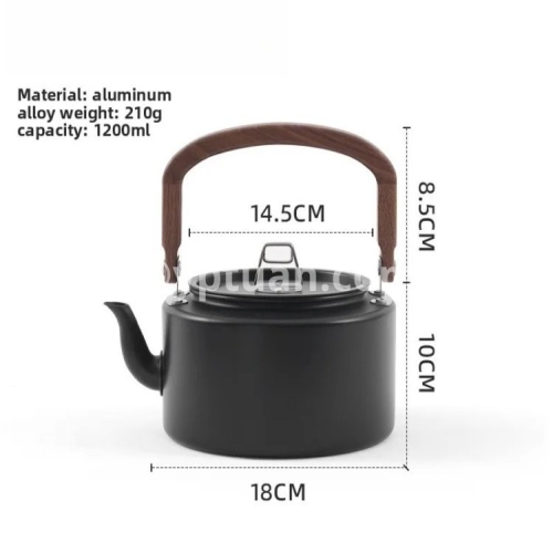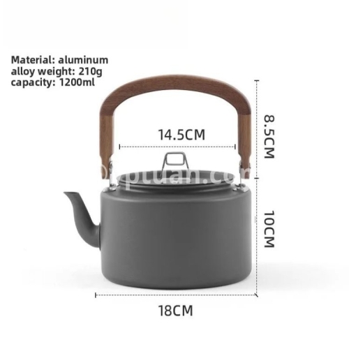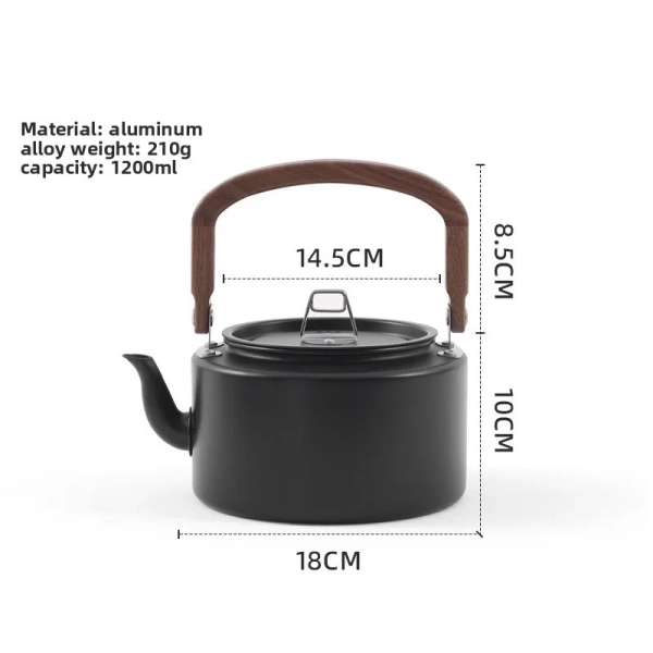 1.2L Lightweight Aluminum Alloy Camping Kettle with Wooden Handle Black And Gray Portable Outdoor Cooking Pot