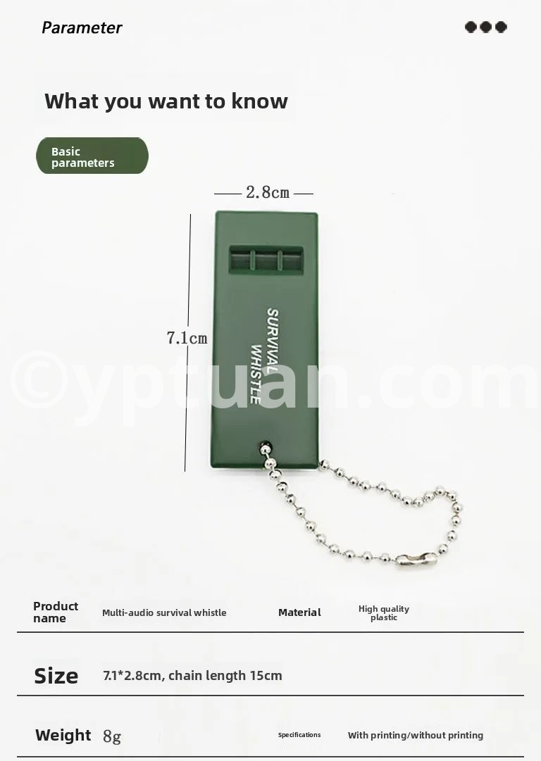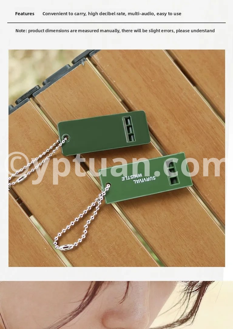5PCS--3-Frequency Whistle High Decibel Survival Whistle Portable Safety Emergency Whistle Rescue Signaling First Aid Tool for Hiking Camping Mountaineering Feature: 1. Portable: With hanging chain, the survival whistle is easy to carry. 2. Good Workmanship: Curved corner design, ultrasonic welding, high volume, good workmanship without burrs. 3. 3-Frequency Whistle: The whistle has three holes, and each hole has a different sound. The sound is pleasing to the ears. 4. Outdoor Tool: When traveling outdoors, you can confirm your location, avoid getting lost, find a companion, and provide assistance. 5. Satisfaction Guarantee: We strive to provide each customer with the highest standard of customer service to ensure you have a pleasant shopping experience. If you have any issues, inquiries or need assistance, please feel free to contact us directly. Specification: Product material: PP Product size: Length: about 70 mm/2.76 inch Width: about 27 mm/1.06 inch Thickness: about 7 mm/0.28inch Note: Due to the different monitor and light effect, the actual color of the item might be slightly different from the color showed on the pictures. Thank you! Please allow 1-2cm measuring deviation due to manual measurement.