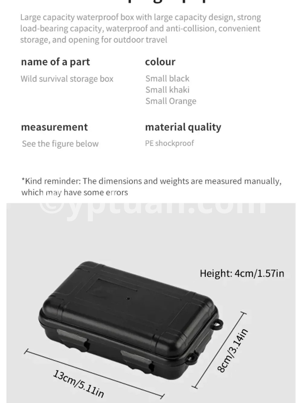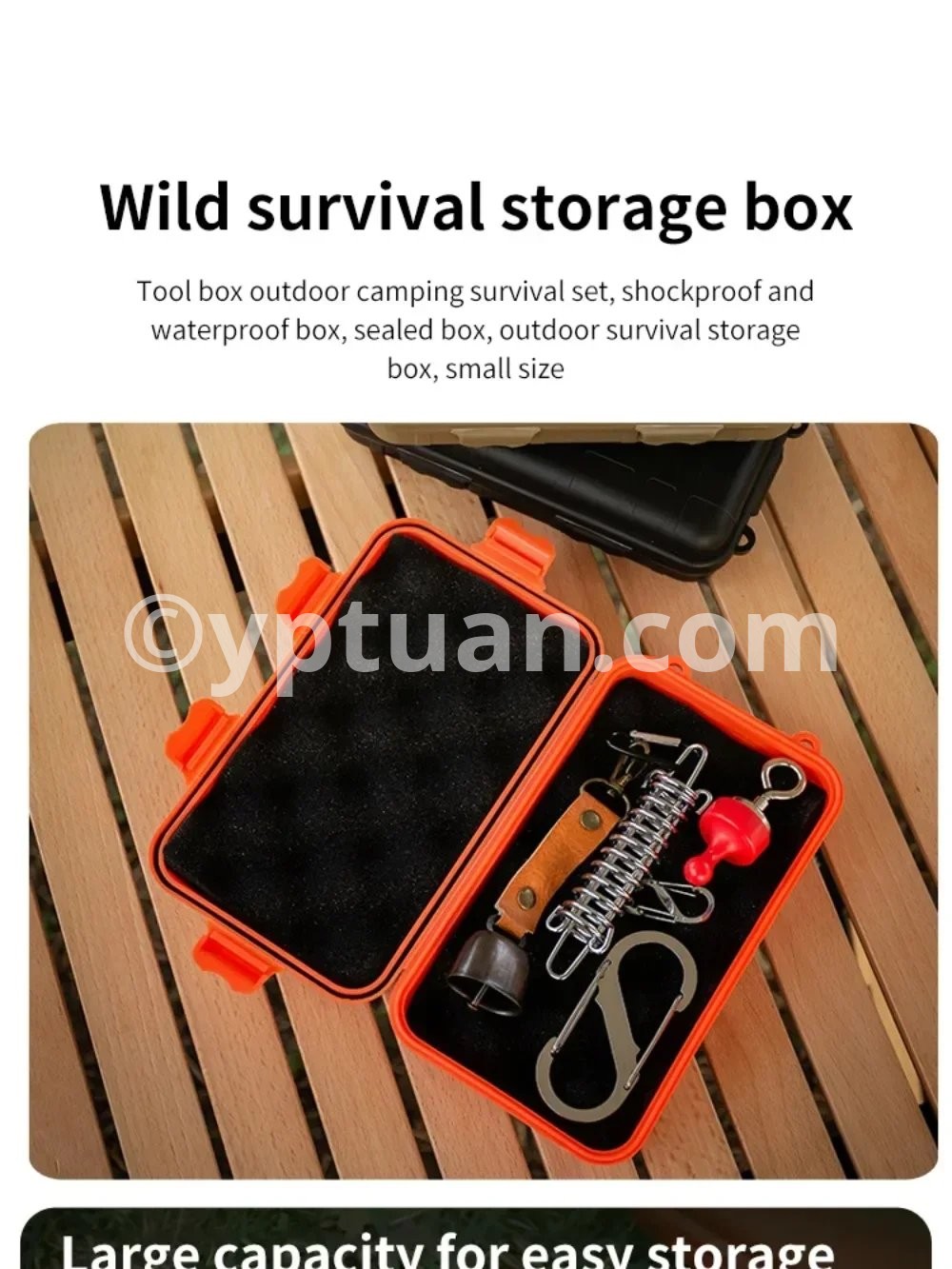 Storage and sorting: The main function of the field survival storage box is to store and sort out all kinds of items needed for field survival. Quick opening and storage: The storage box for field survival is simple and easy to use, and users can quickly open and close the box. This helps to save time and improve the convenience of use. Origin: China. Specification: 320ml-1520ml Features are sustainable, foldable and well stocked. Color: black, khaki, orange The outdoor survival storage box has many functional features, such as storage and arrangement, waterproof material, weather resistance, portable design, quick opening and storage, internal compartment and separation, safety buckle and zipper, anti-fall and impact, portability and personalized design. These functions make the outdoor survival storage box a practical equipment in outdoor activities, which is convenient for users to store and sort out various necessities.