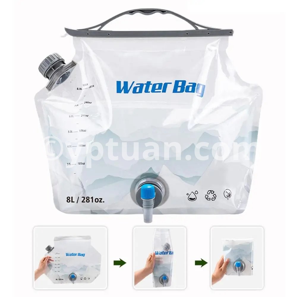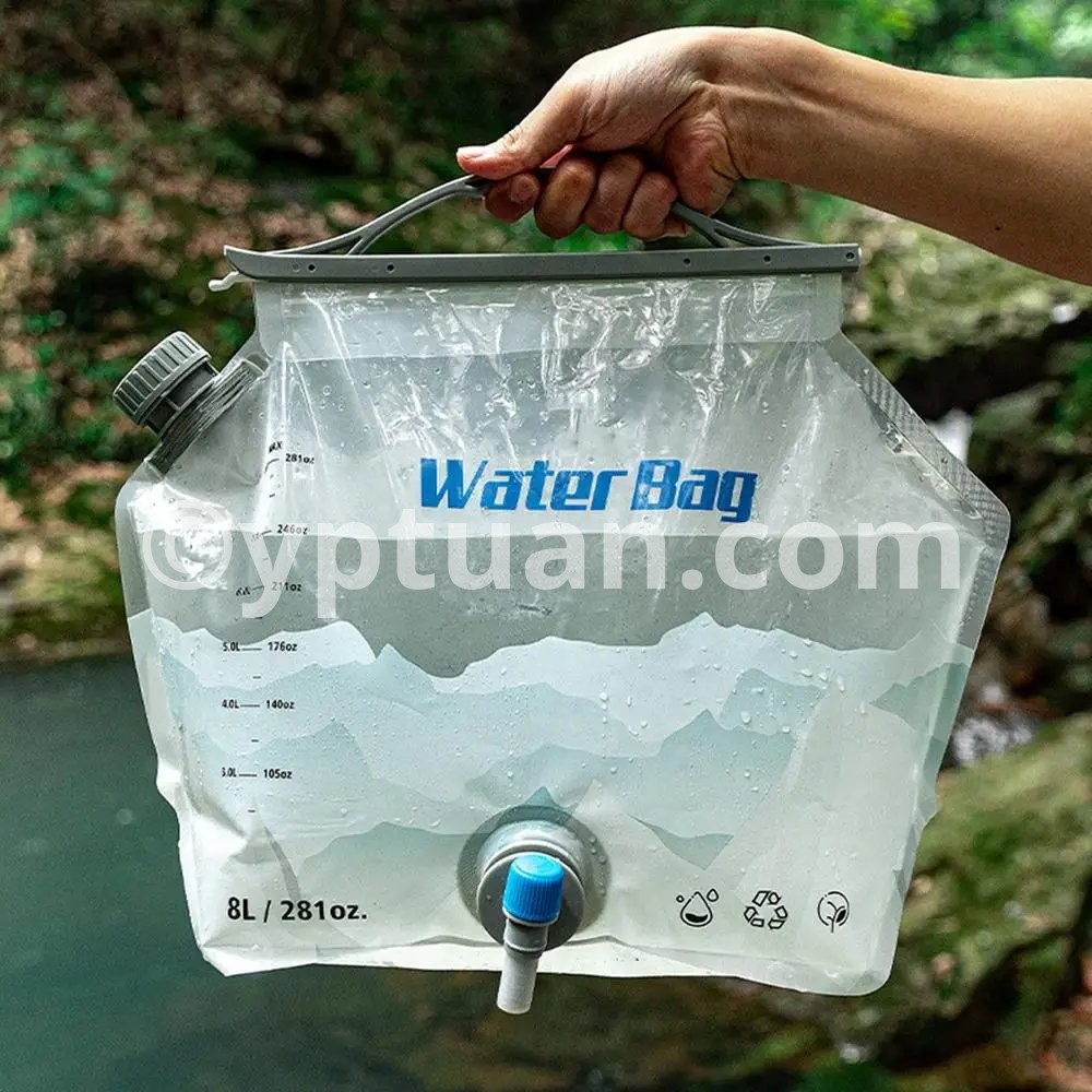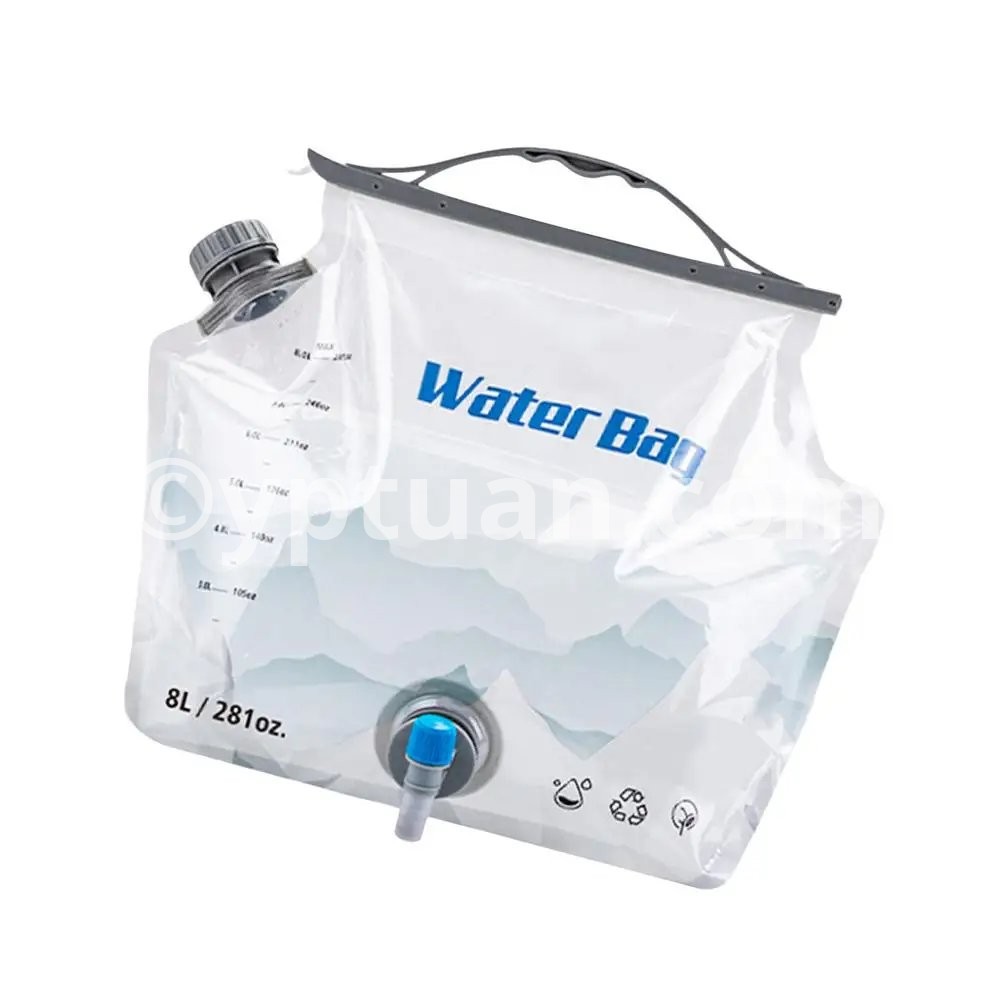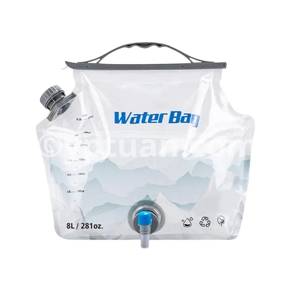 Bullet Points: 1.Durabilityand Strength: Made of PET+PA+PE composite material, this water container bag is thicker which makes it highly resistant to falls. Its soft and elastic texture also provides strong bearing capacity. 2.Space-Saving Hydration: Ingeniously designed with a triangular stable structure, this water container bag boasts thickened edge pressing for durability, ensuring it stands steady; foldable yet stable, it's the epitome of convenience. 3.Super Portable: The water bag's lightweight design makes it effortless to carry, while its high-strength toughness ensures durability for all your adventures. The ergonomic and reinforced handle further enhances portability. 4.Effortless Hydration: Enjoy 8L of increased water storage with a water-tight seal strip and detachable clamp, ensuring double protection and adjustable output through a rotary faucet. 5.Widely Used: Whether it's sports events, camping & hiking, backpacking, or barbecues, this water container bag is a must-have for anyone who loves the great outdoors. With a steady standing design, adjustable water output, and an outer pocket that identifies water levels for easy monitoring, this water bag is perfect for all your outdoor adventures. Name: Household can disassemble and wash water bag Capacity: 8L Material: PET/PA/ PE three-layer composite material Product Size: 42.3x35.6cm/16.6x14.0in Weight: 147g Heat resistance temperature: 0-60℃ List: Water Container Bag x1