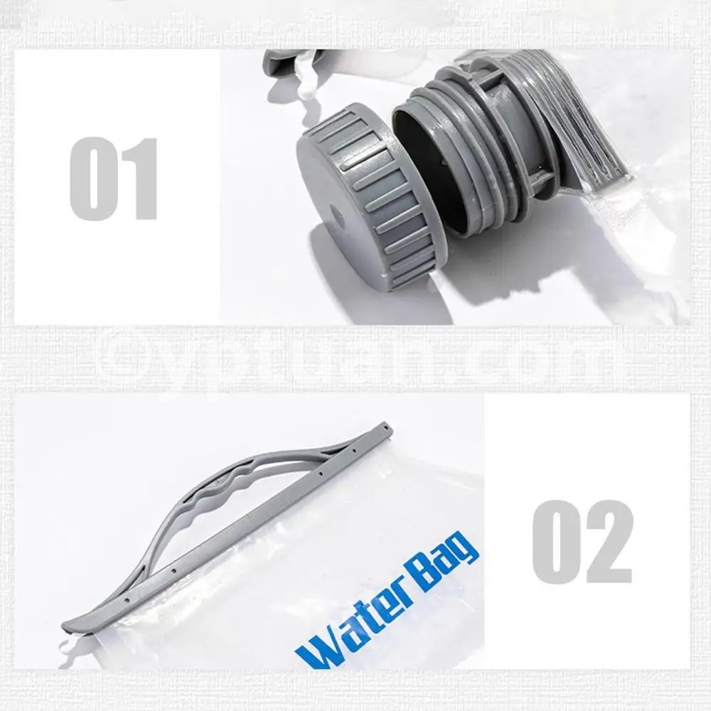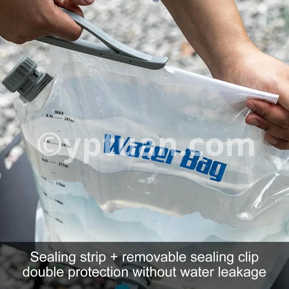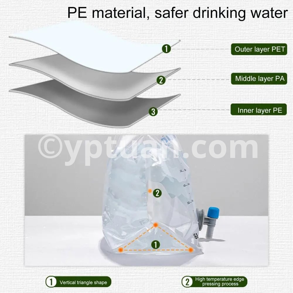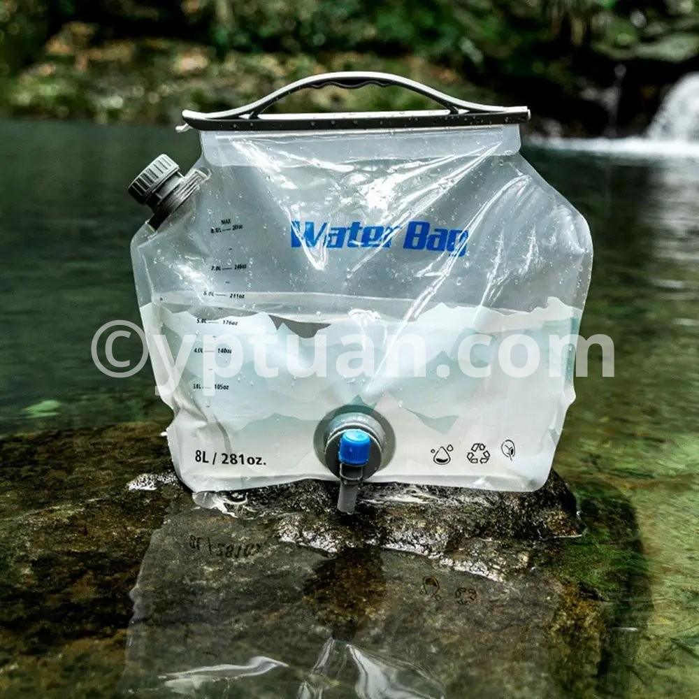 Bullet Points: 1.Durabilityand Strength: Made of PET+PA+PE composite material, this water container bag is thicker which makes it highly resistant to falls. Its soft and elastic texture also provides strong bearing capacity. 2.Space-Saving Hydration: Ingeniously designed with a triangular stable structure, this water container bag boasts thickened edge pressing for durability, ensuring it stands steady; foldable yet stable, it's the epitome of convenience. 3.Super Portable: The water bag's lightweight design makes it effortless to carry, while its high-strength toughness ensures durability for all your adventures. The ergonomic and reinforced handle further enhances portability. 4.Effortless Hydration: Enjoy 8L of increased water storage with a water-tight seal strip and detachable clamp, ensuring double protection and adjustable output through a rotary faucet. 5.Widely Used: Whether it's sports events, camping & hiking, backpacking, or barbecues, this water container bag is a must-have for anyone who loves the great outdoors. With a steady standing design, adjustable water output, and an outer pocket that identifies water levels for easy monitoring, this water bag is perfect for all your outdoor adventures. Name: Household can disassemble and wash water bag Capacity: 8L Material: PET/PA/ PE three-layer composite material Product Size: 42.3x35.6cm/16.6x14.0in Weight: 147g Heat resistance temperature: 0-60℃ List: Water Container Bag x1