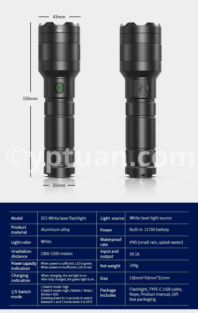 - Real 1200-1500 Meters - Built in 21700 Battery - Type C Rechargeable - LEP White Laser Flashlight - Original Manufacturer / Factory - For detailed parameters, please see the details below Tips: We support dropshipping and wholesale. If you are interested in our NATFIRE SF2, then Click " contact " to leave us message to get the best wholesale price.