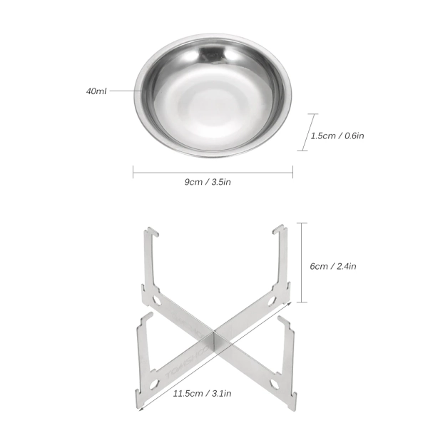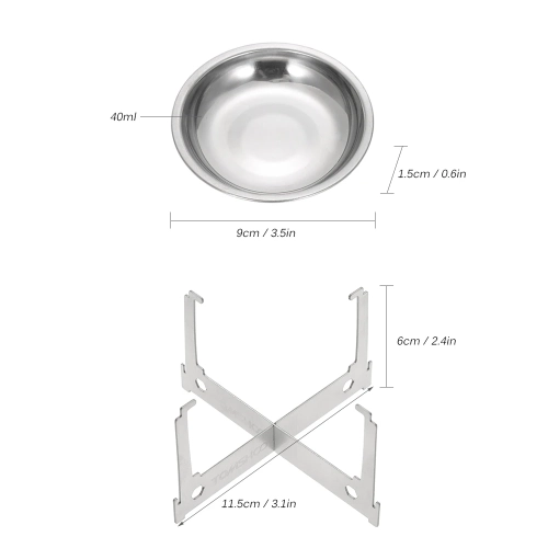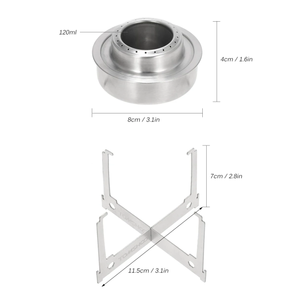 Mini alcohol stove with foldable stand, compact and ultralight, perfect for outdoor camping, hiking, and home use. Features: Compact, portable, lightweight spirit burner with stove stand. Rugged cross stand offers stable support and gives an optimal height to burn the stove efficiently. Quickly breaks down into a mini size, convenient to carry in your backpack, handbag. Alcohol stove set: Specifications: Material: Stainless steel Stove size: 8 * 4cm / 3.1 * 1.6in Capacity: 120ml Weight: 80g / 2.8oz Rack size: 11.5 * 7cm / 4.5 * 2.8in Weight: 35g / 1.2oz Alcohol tray set : Specifications: Material: Stainless steel Tray size: 9 * 1.5cm / 3.5 * 0.6in Capacity: 40ml Weight: 20g / 0.7oz Rack size: 11.5 * 6cm / 4.5 * 2.4in Weight: 35g / 1.2oz Package List (Alcohol stove set): 1 * Alcohol Stove 1 * Stove Rack Package List (Alcohol tray set): 1 * Alcohol Tray 1 * Rack