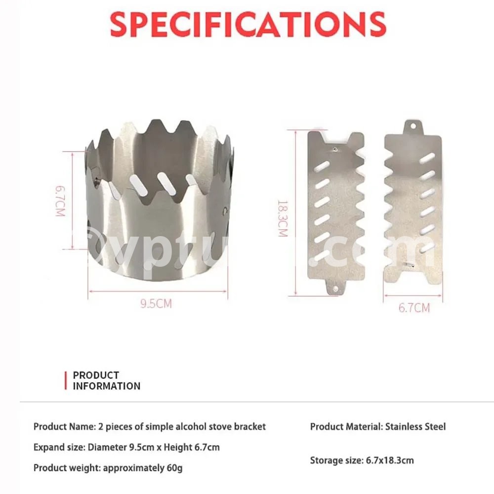 TARKA Portable Wind Shield Suitable For Alcohol Stove Ultralight Rack Stand Windscreen Outdoor Camping Hiking Camping Supplies Product Name: 2 pieces of simple alcohol stove bracket (excluding stove) Bracket size: Diameter 9.5cm x Height 6.7cm Storage size: 6.7x18.3cm Weight: Approximately 60g Material: Stainless steel Usage: Camping, hiking, tourist, travel, trekking, picnic, party, tourist etc. Tips: 1.Product dimensions are measured manually, please allow an error of 1-2cm. 2.Due to the difference between different monitors, the pictures may not reflect the actual color of the item. 3.If you have any other question, you can feel free to contact us.