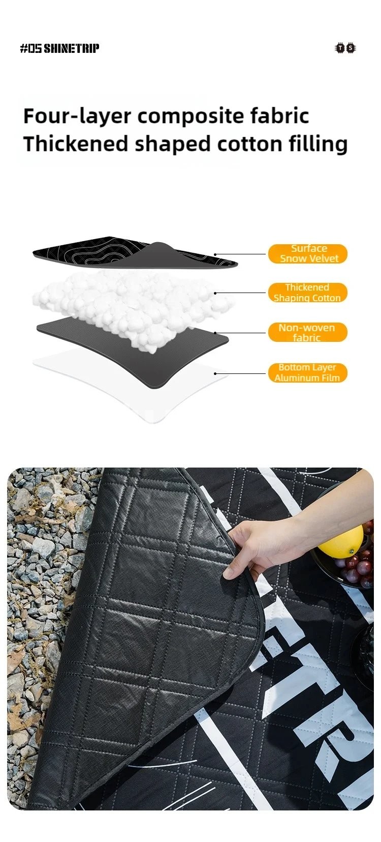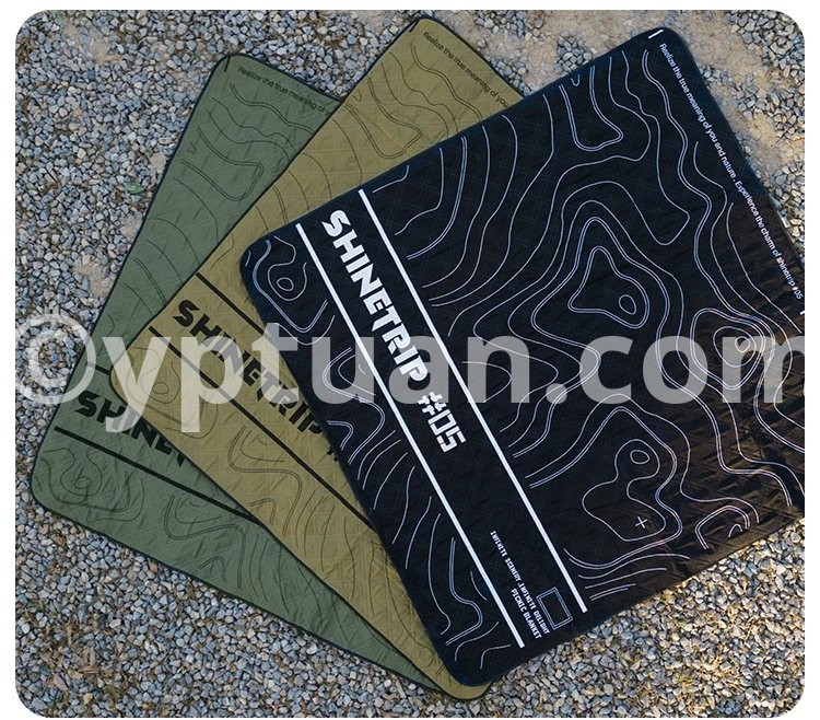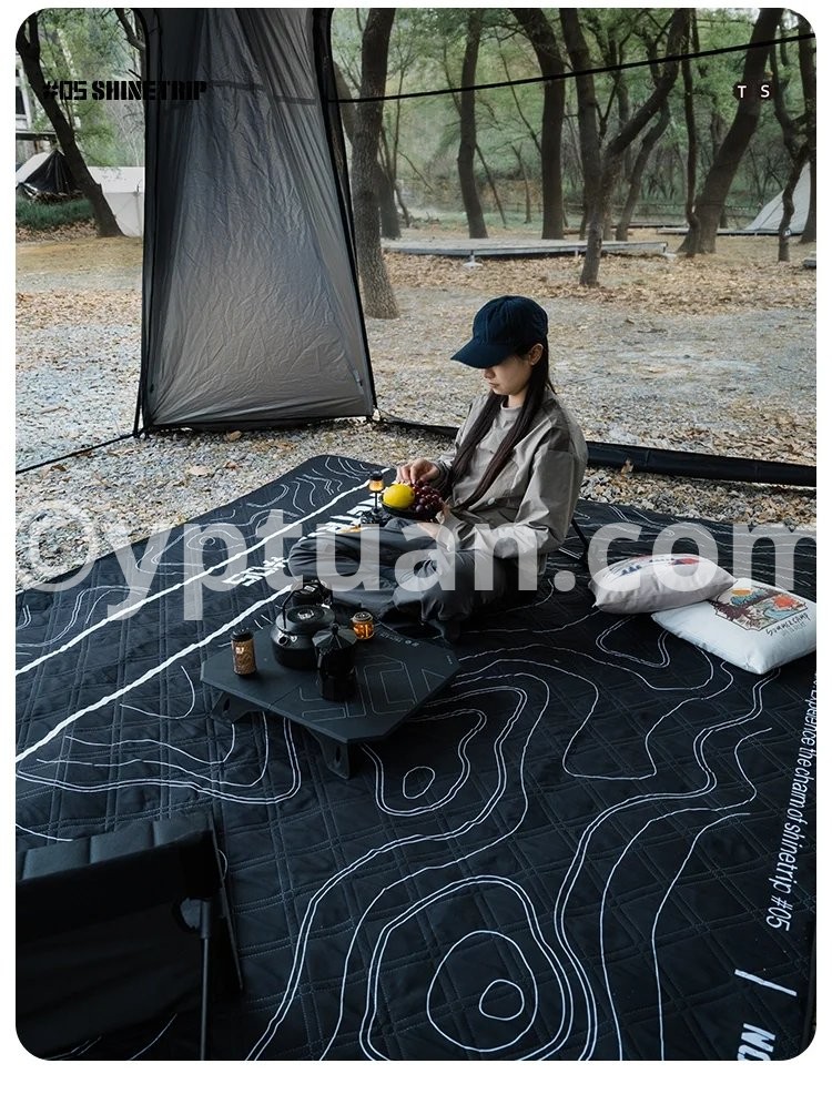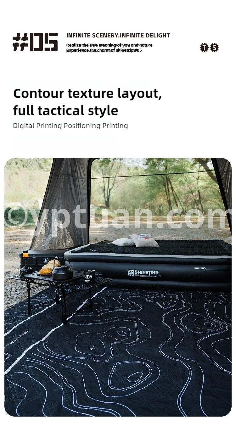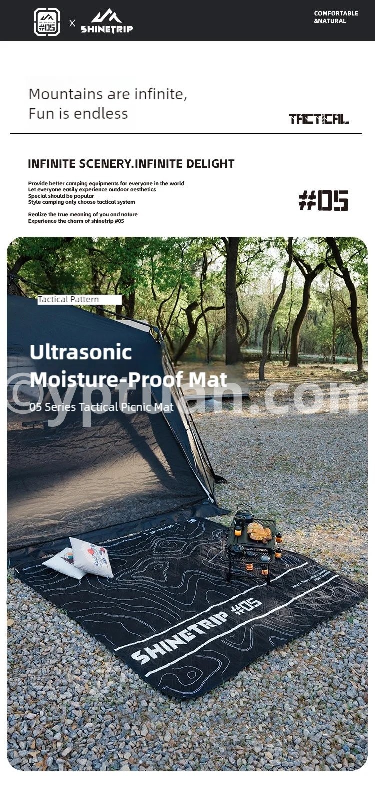 1.The ShineTrip Ultrasonic Aluminum Film Picnic Mat features a unique contour texture layout and tactical style design, ensuring a stylish and functional outdoor experience. Its digital printing positioning printing offers a visually appealing large area multi size mat that's perfect for any picnic or outdoor activity.