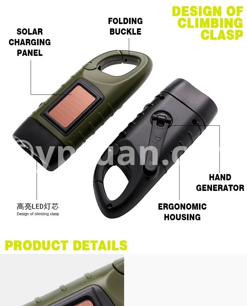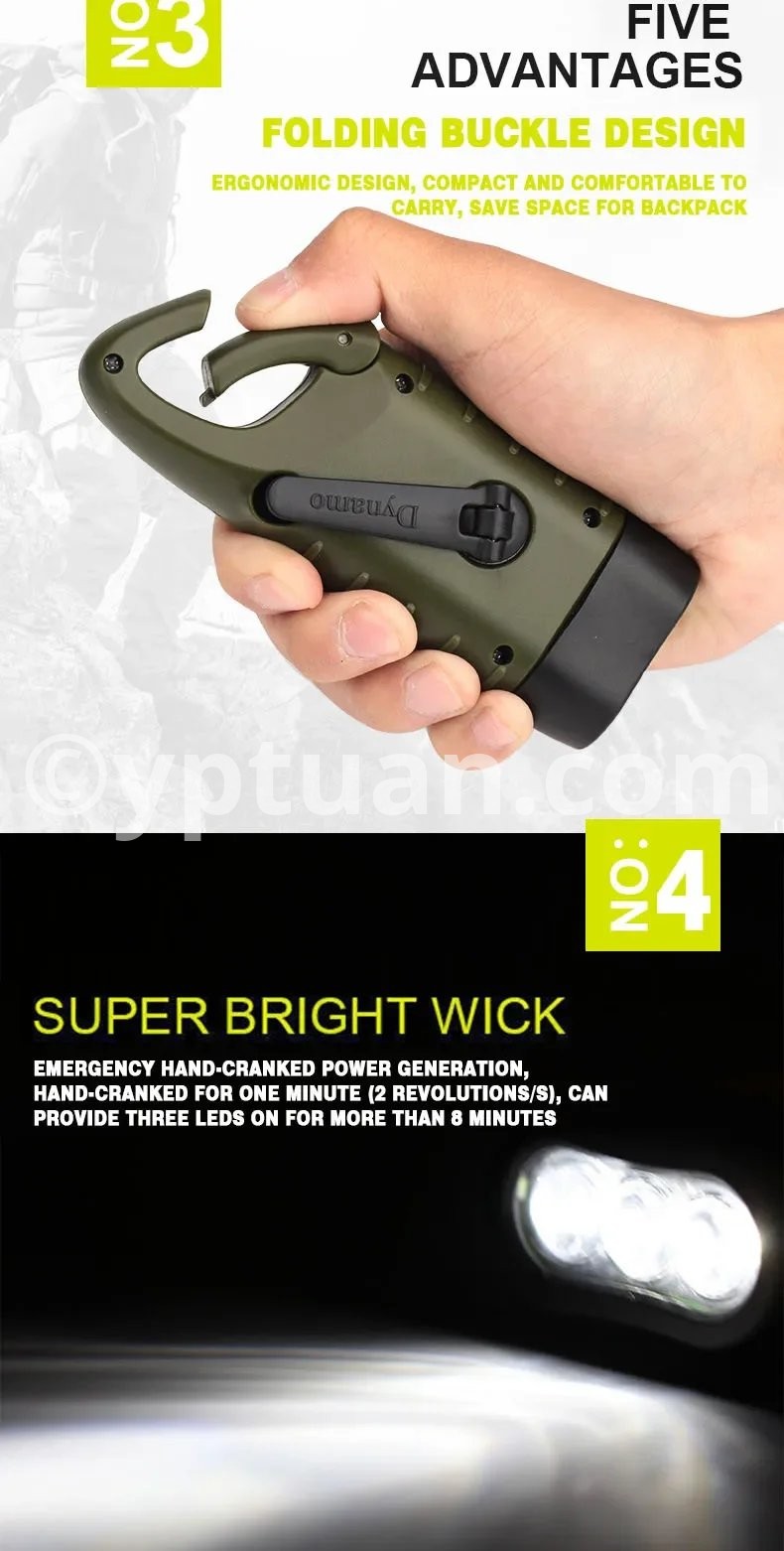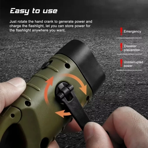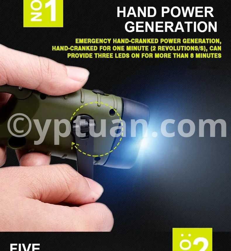 The solar hand crank flashlight works anywhere there is sun light, easy to use and carry, which is a good helper for your outdoor travel and mountaineering.