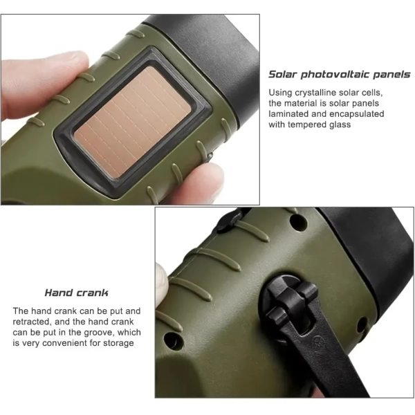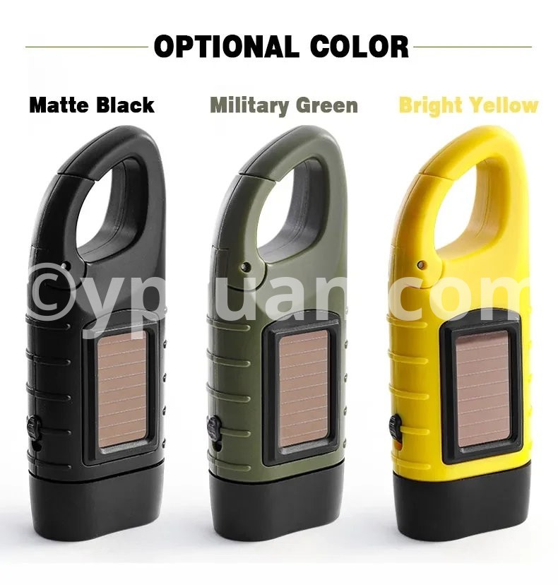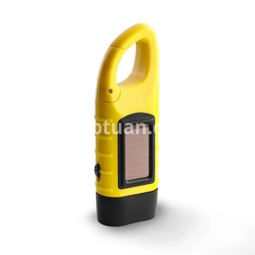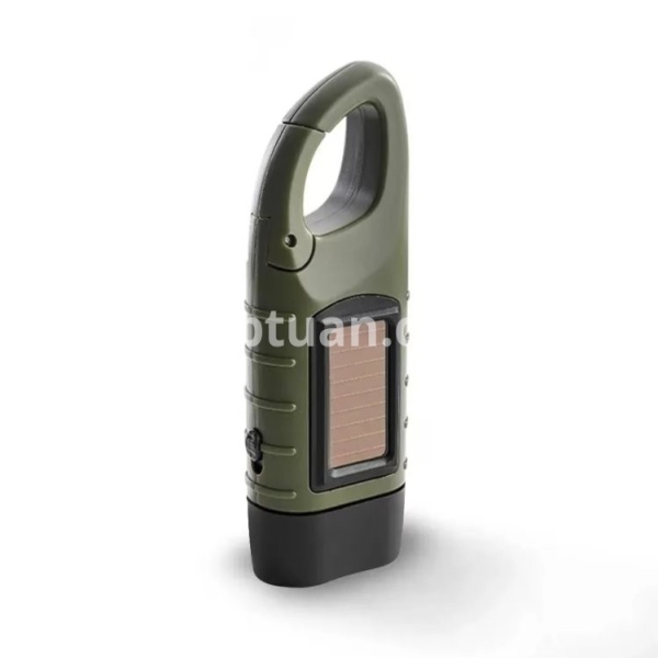 1. Solar: A flashlight with solar and hand-crank charging. With the built-in battery, you can save energy for a long time without an external battery. Using crystalline silicon solar cells, the material is a solar cell panel laminated with tempered glass.
