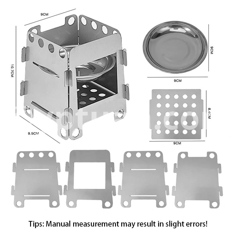 Tips: Please be careful during assembly or wear gloves to prevent scratches on the skin. Product Introduction: Name: Multifunctional outdoor wood stove Material: Furnace body/bracket: high temperature resistant stainless steel (anti-deformation, corrosion resistant), wind shield: perforated stainless steel mesh (windproof and combustion-supporting) Fuel adaptability: firewood, charcoal, solid alcohol (strong compatibility) Size: Refer to the main picture and detailed size diagram for a more intuitive display Weight: about 200g Use scenario: camping, picnic, family courtyard barbecue Features: 1. Efficient combustion system: secondary air intake design, bottom air inlet + wind shield air convection, no blower required for full combustion, firepower increased by 30%. The butterfly-shaped furnace structure expands the fuel contact area, burns more thoroughly, and reduces smoke. 2. Modular design: The detachable bracket can be assembled quickly to meet different cooking needs (cooking, barbecue). After folding, it is like a flat plate and can be easily stuffed into a backpack or car trunk. 3. All-terrain compatibility: The four-corner bracket adapts to uneven ground to prevent tipping. Compatible with firewood, charcoal, and alcohol blocks to solve the problem of outdoor fuel shortage. 4. Environmental protection and energy saving: high combustion efficiency, reduced fuel waste, easy to clean up ashes. Precautions: 1. Safe use: stay away from flammable objects such as tents and trees, and keep a safe distance of at least 2 meters. 2. Fuel selection: use dry firewood or standard charcoal, wet fuel is easy to produce thick smoke. 3. The alcohol block needs to be placed in a 9*9cm round container to avoid direct contact with the furnace body. 4. Cleaning and maintenance: remove ashes after cooling, and wipe the furnace body with a soft cloth regularly to prevent rust. Avoid hard objects scratching the windshield mesh when folding. Tips: 1. Due to lighting effects, monitor brightness/contrast settings, etc., the color of the website pictures is slightly different, and the actual product is slightly different. Please refer to the actual product! 2. The size or weight of the item are measured manually, and there may be slight errors. Thank you very much for your understanding! 3. If there is any problem with the product, please contact me before leaving a comment, I will do my best to solve the problem for you, thank you for your understanding!