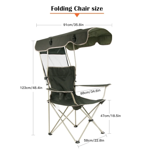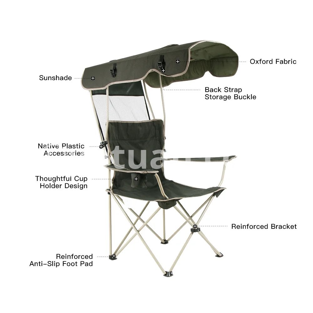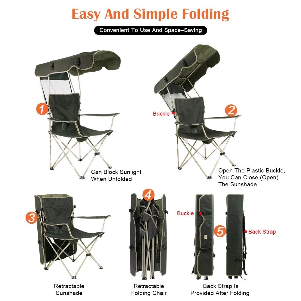 Enjoy your outdoor activities with our portable folding chair with canopy shade. This beach chair is perfect for camping, lawn activities, and other outside events. It features a retractable sunshade, a reinforced bracket, and a thoughtful cup holder design. The chair is made of high-strength Oxford fabric, ensuring comfort and durability. It also comes with a back strap storage buckle for easy transport.