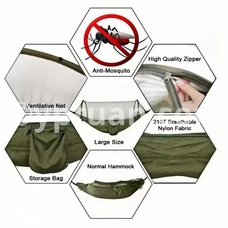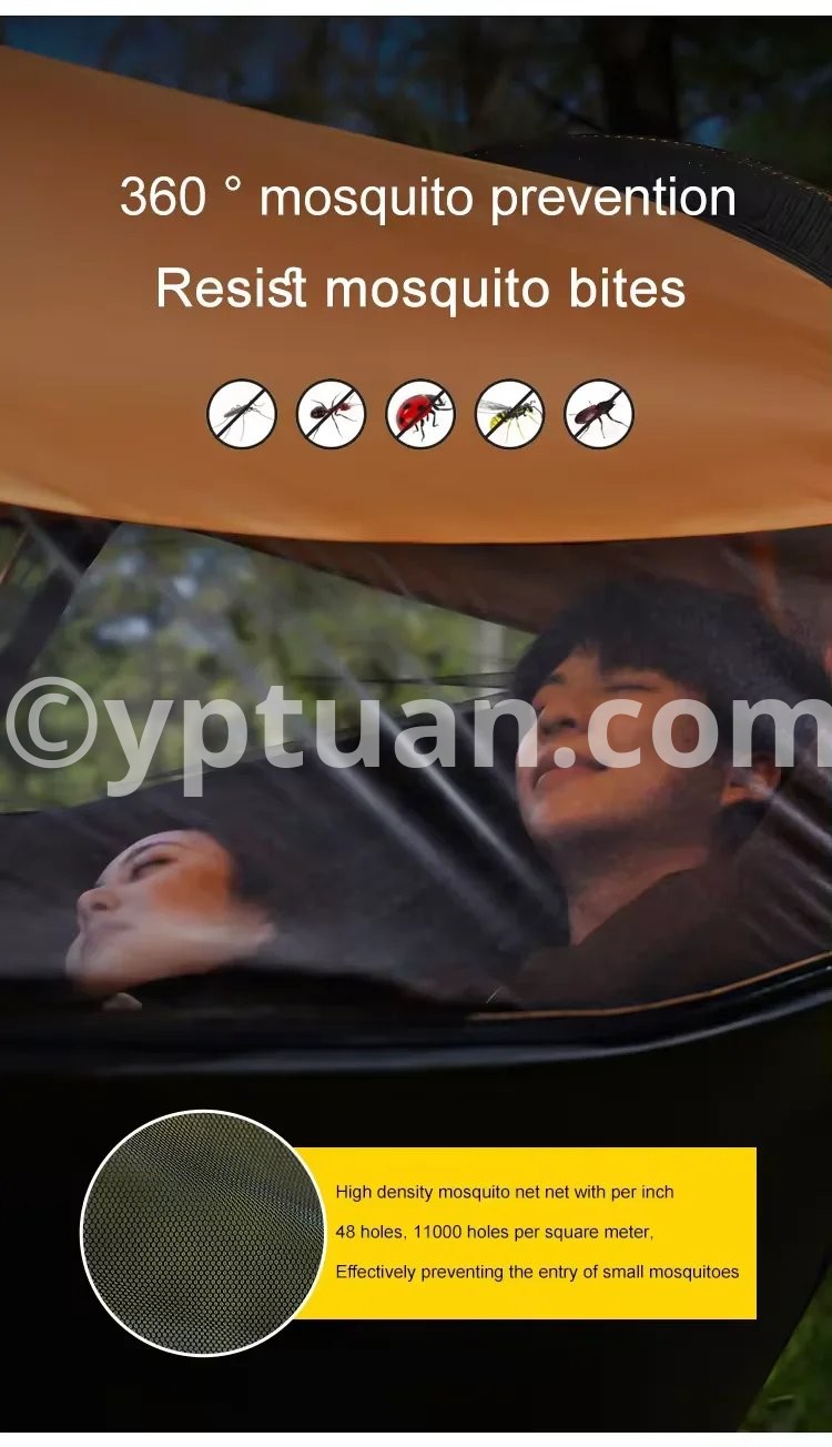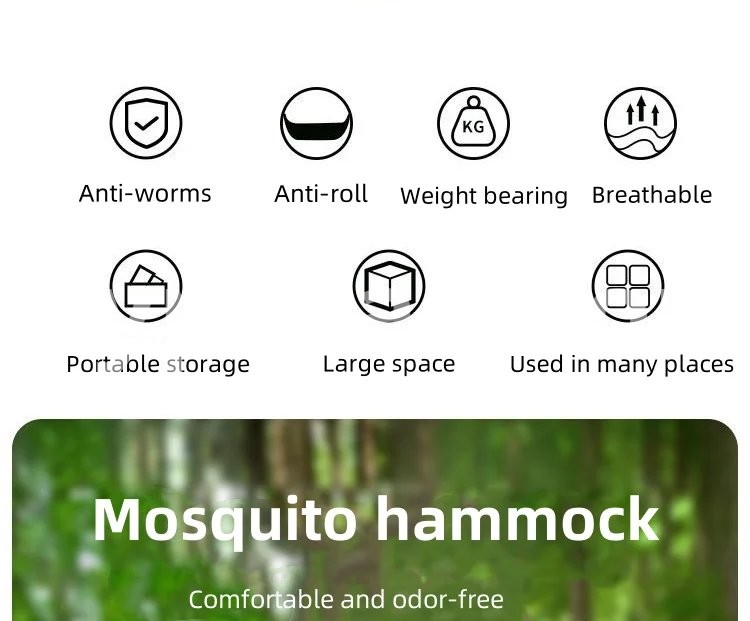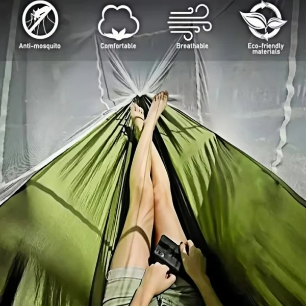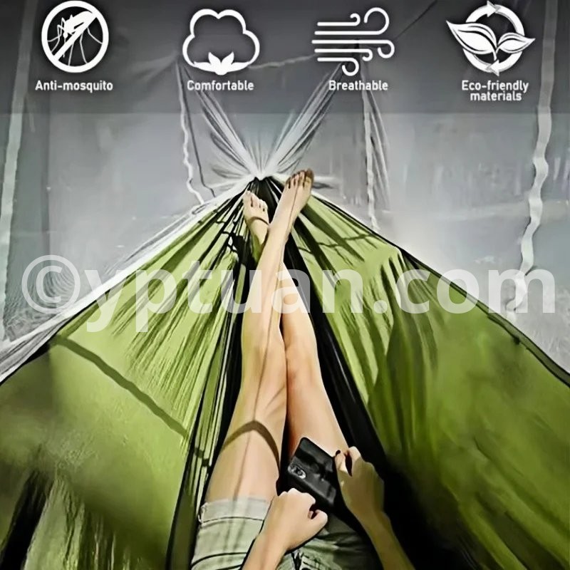 - **Innovative Mosquito-Protection Design**: Featuring a high-density, breathable mosquito net with secure encryption, our camping hammock effectively keeps mosquitoes, insects, and bugs away — ensuring uninterrupted rest and privacy during outdoor excursions. Perfect for camping, hiking, backpacking, and outdoor festivals.