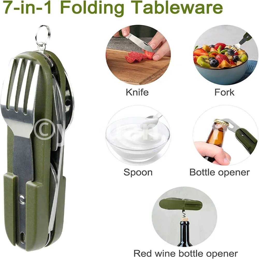 Multifunctional 7 in 1 Outdoor Tableware Stainless Steel Foldable Fork Spoon Knife Set for Camping Hiking Picnic Travel Durable