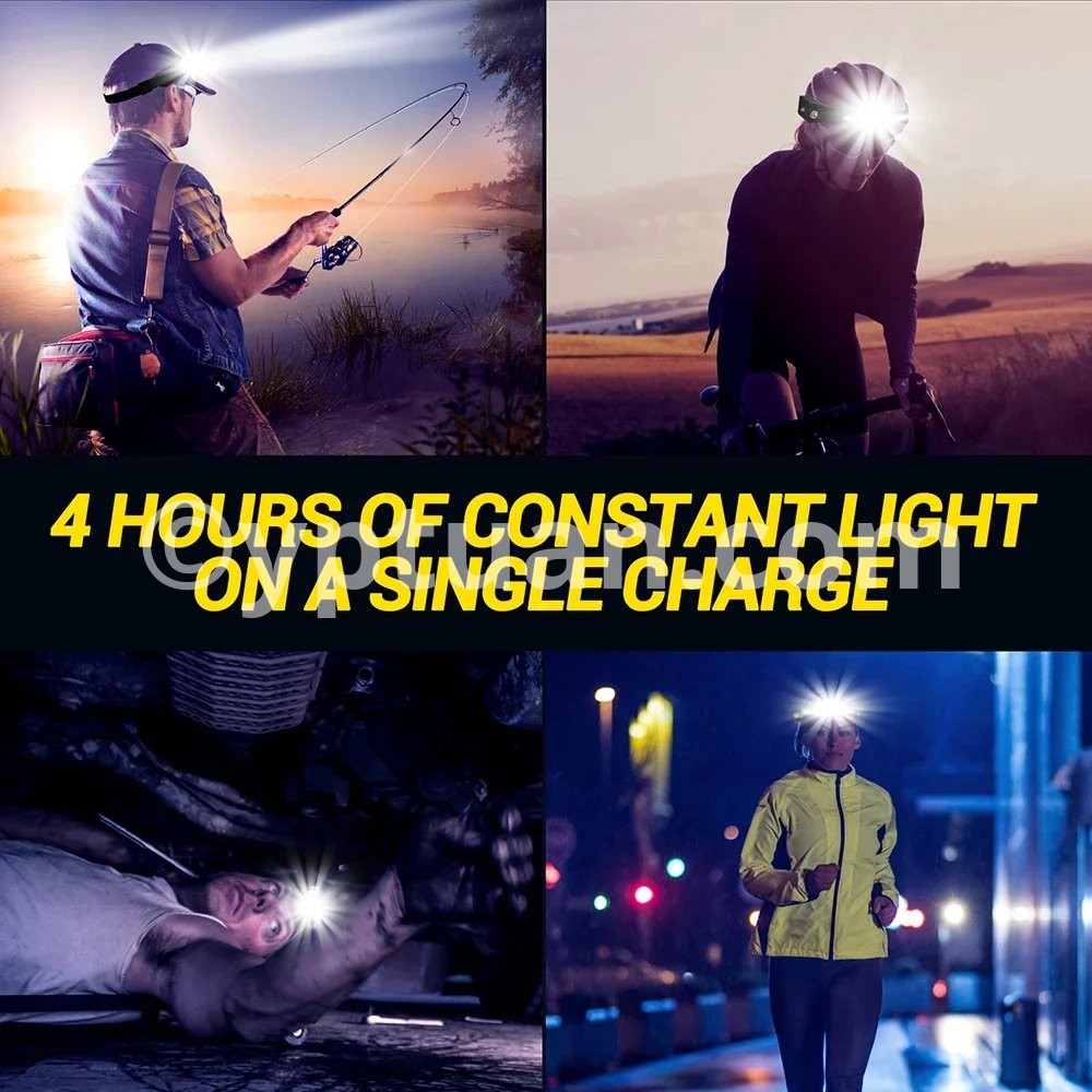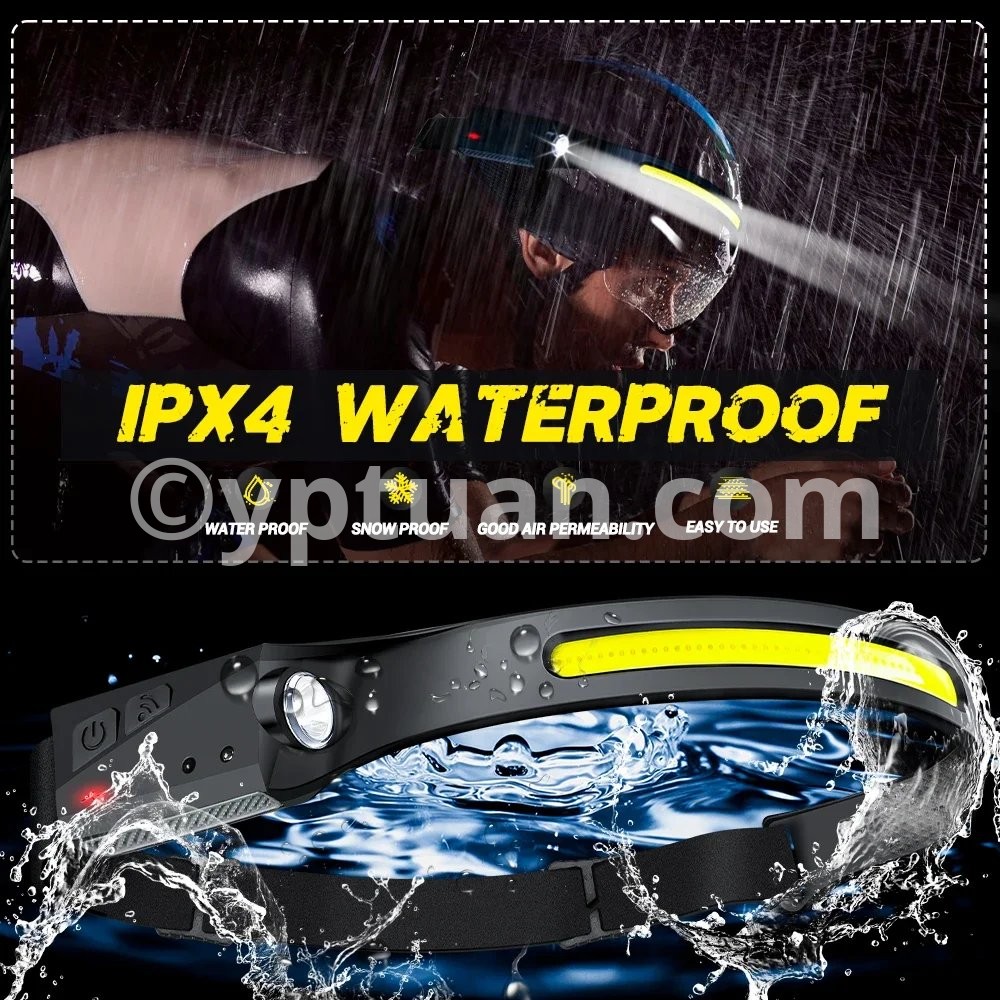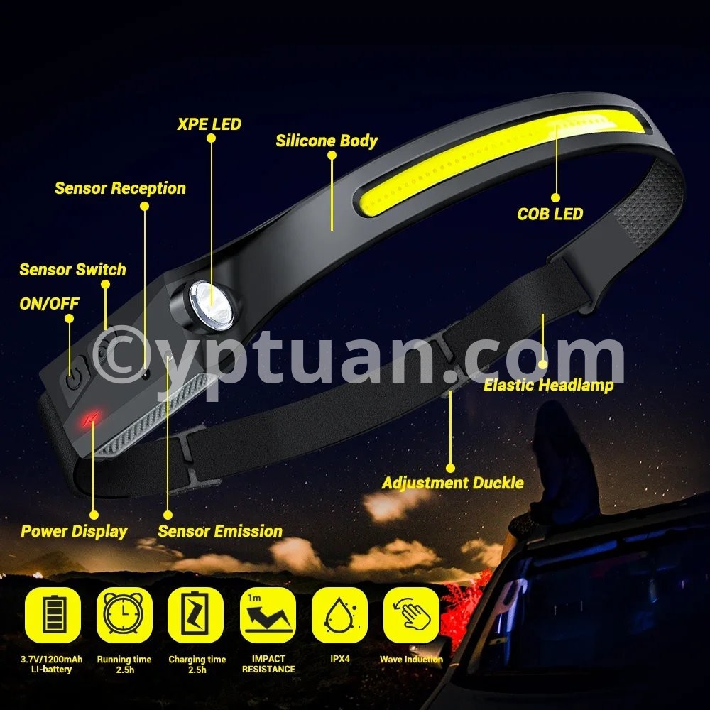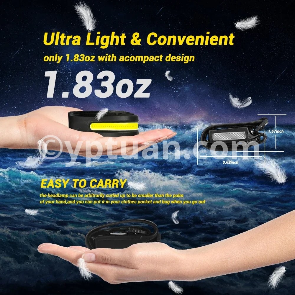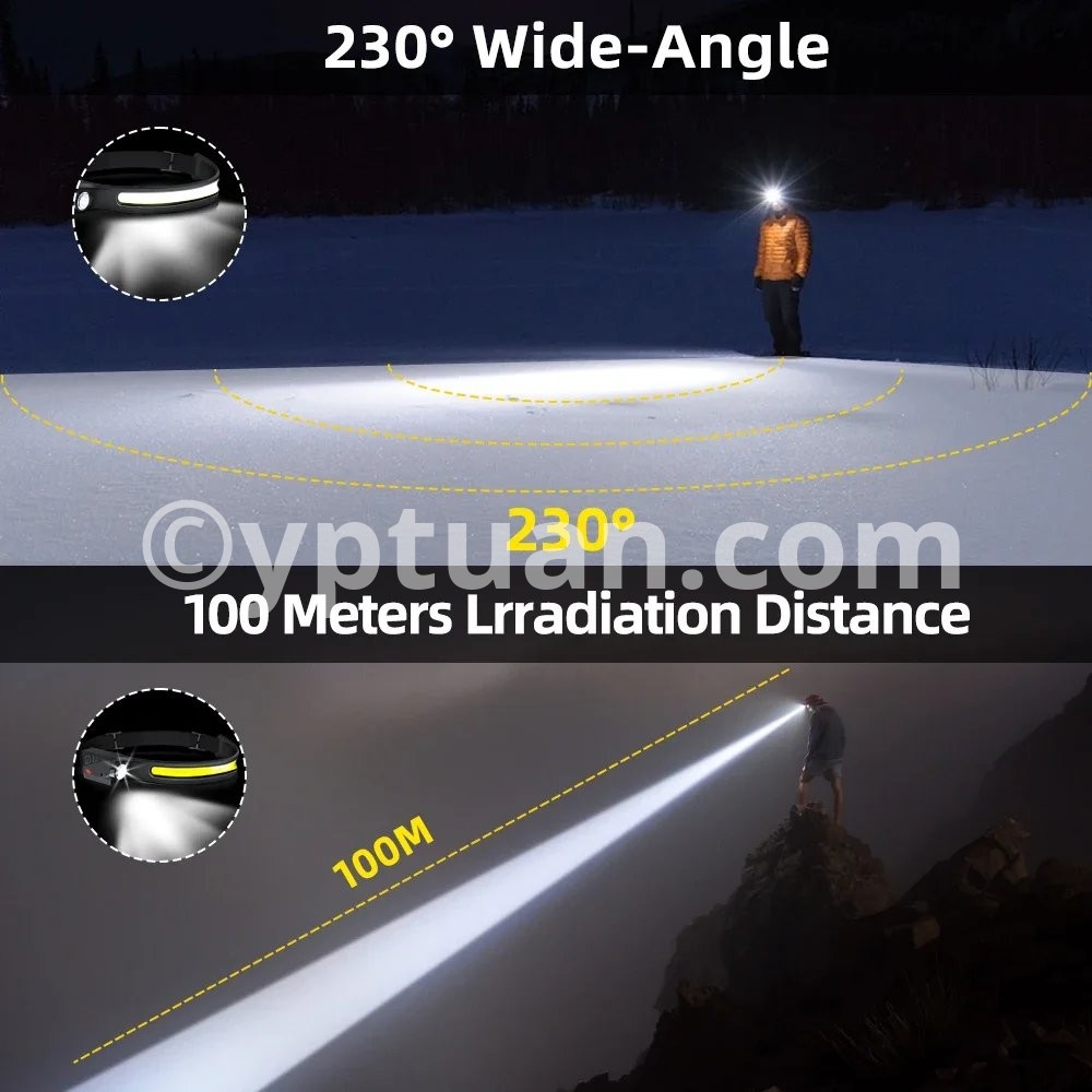 【230° WIDE BEAM HEADLIGHT & SPOTLIGHT】 - The new 230° wide beam headlight allows you to illuminate the viewing area without moving your head. Unlike traditional headlights, it has a better view, and you can also use its spotlight to focus on specific areas. 【MOTION SENSOR MODE】 - LED Headlamp Camping Accessories is equipped with the latest intelligent sensors. Even if wearing gloves, as long as the distance from the device is within 10 cm, you can quickly switch the ON/OFF by waving your hand in motion mode. 【6 LIGHT MODES】 - press the power button to cycle through, COB light high, COB light low, XPE high, XPE low, Strobe Mode, Motion Sensor, long press the On/Off Button to transform the strobe mode, then the XPE and COB light will flash at the same time. 【LIGHTWEIGHT & COMFORTABLE】 - The Rechargeable headlamp is composed of soft silicone and an adjustable elastic headband, suitable for adults or children. The product weighs only 2.4oz. Small size design can be folded and easily put into the pocket. 【WATERPROOF & MULTIPURPOSE】 - The headlight is IPX4 waterproof. You don't need to worry if it rains or snows suddenly. It is ideal for outdoor lovers as camping gear. Whether you are camping, exploring, hiking, cycling, fishing,climbing, repairing and other outdoor or indoor activities, our headlamps are your good assistants.
