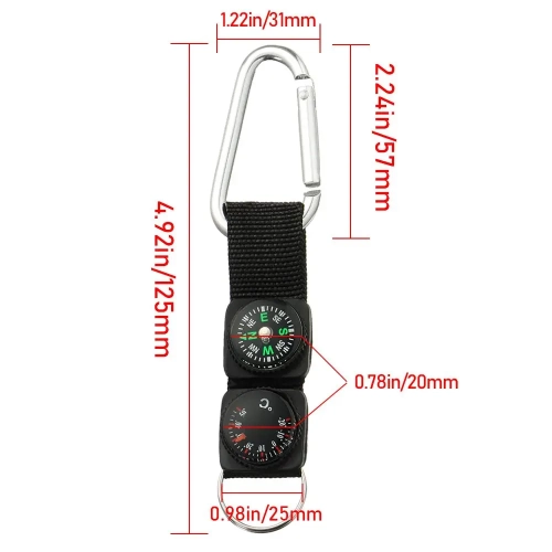 100% Brand new and high quality Name:Multifunction 3 In 1 Camping Climbing Hiking Mini Carabiner Keychain Compass Thermometer Hanger Key Ring Black Material: Metal and Cloth Color: Black Total Length (approx.): 12.5cm Key Ring Diameter (approx.): 2.5cm Size (approx.): 125x31x14mm Carabiner Length 57mm, Width 31mm Package Included: 1XCompass Thermometer Carabiner Note: 1. Due to the light and the difference screen adjustment, the color of the item may be slightly different from the images. 2. Please allow 1-3cm measurement deviation due to manual measurement.