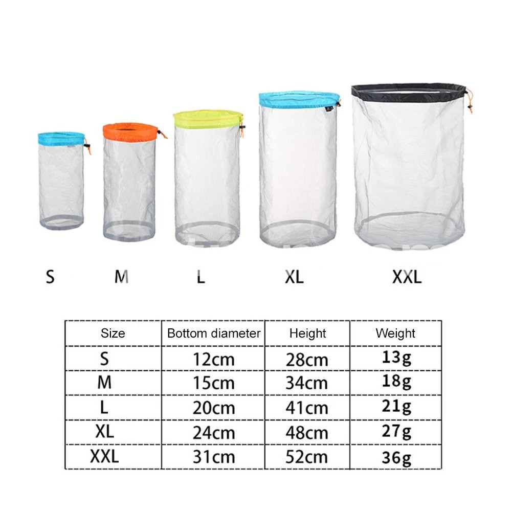 Portable Storage Bag Waterproof Drawstring Compression Stuff Sack Bag Dustproof Space Saving Carry Pouch for Outdoor Backpacking Feature: 1. Versatile Storage Solution: Perfect for outdoor activities and everyday use, this storage bag can be used to store clothes, sleeping bags, and other essentials. 2. Lightweight and Portable: Easy to carry and foldable, this storage bag is perfect for outdoor enthusiasts who need a convenient storage solution on the go. 3. Multiple Colors and Sizes Available: With a variety of colors and sizes to choose from, this storage bag makes it easy to stay organized and keep track of your belongings. 4. Durable Construction: Made with high-quality materials, this storage bag is built to last and withstand the wear and tear of outdoor adventures. 5. Efficient Compression: The drawstring design of the storage bag allows you to easily compress your belongings, saving space and making packing easier. Specification: Origin: Mainland China Material: 50D polyester mesh fabric Color: Black, Dark Grey (optional) Size: S: About 28x12cm/11.02x4.72 inches M: About 34x15cm/13.39x5.91 inches L: About 41x20cm/16.14x7.87 inches XL: About 48x24cm/18.90x9.45 inches XXL: About 52x31cm/20.47x12.20 inches Note: Due to the different monitor and light effect, the actual color of the item might be slightly different from the color showed on the pictures. Thank you! Please allow 1-2cm measuring deviation due to manual measurement.