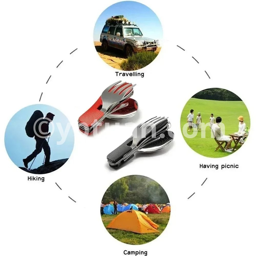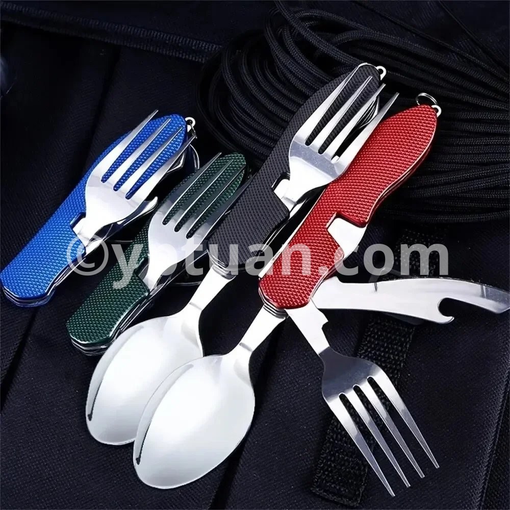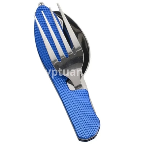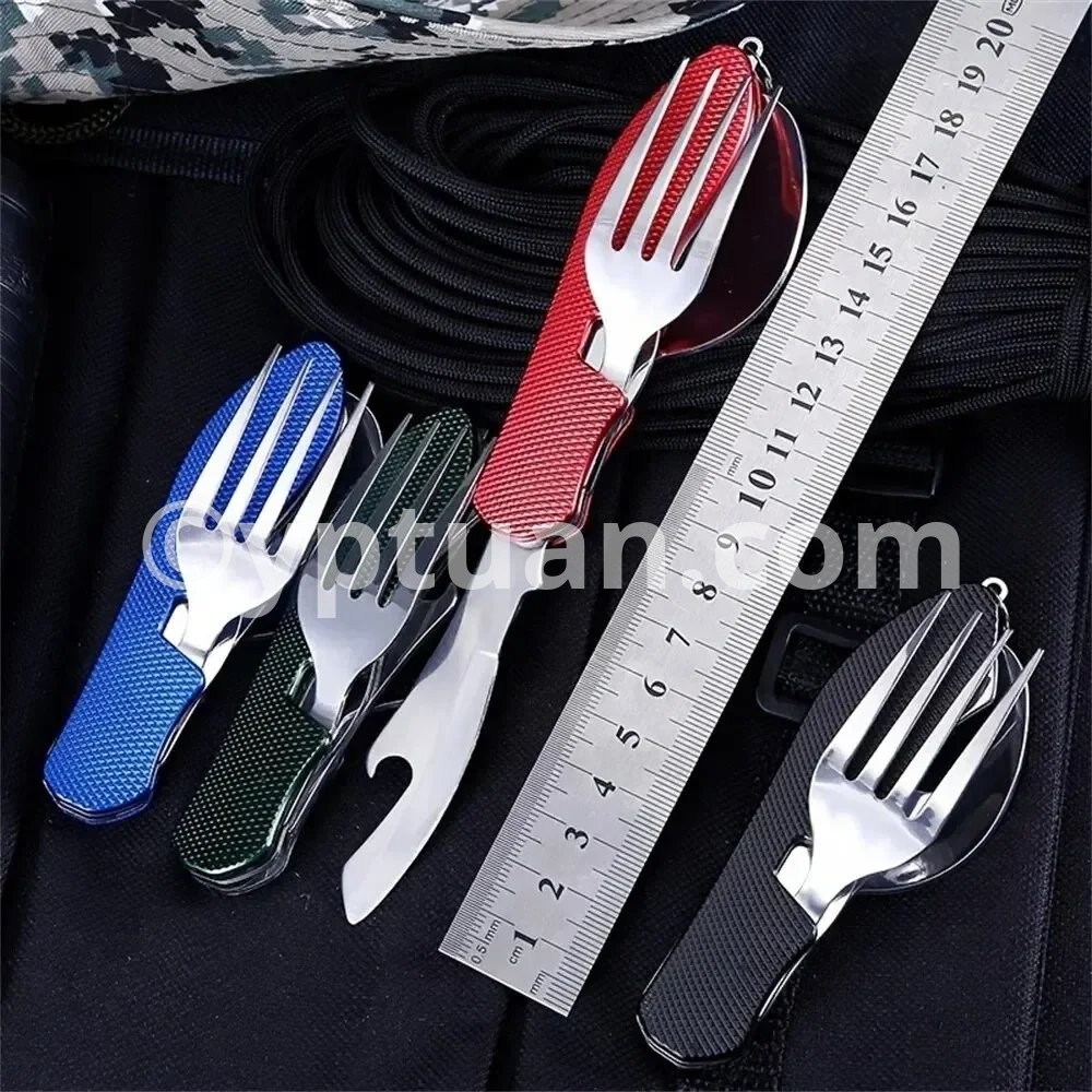 • Multi-Functional Set :This set includes a knife, fork, and spoon, providing all your dining needs in one convenient package. • Stainless Steel Material :Crafted from robust stainless steel, this set is designed to withstand the rigors of outdoor use and last for years. • Versatile Use :Perfect for camping, picnics, travel, and other outdoor activities, this set is your ideal dining companion. • Boiling Water Safe :The set is safe to hold boiling water, making it suitable for various cooking scenarios. • Compact and Foldable :The set folds flat for easy storage and portability, making it an ideal choice for outdoor adventures. Description Versatile: This camping tableware set includes a knife, fork, and spoon all in one compact design. Portable: The mini foldable and detachable design makes it easy to carry and store in your backpack or pocket. Durable: Made with high-quality materials, this combination tableware is built to withstand outdoor activities like mountaineering and camping. Easy to clean: The smooth surface and detachable design make it easy to clean and maintain. Perfect for outdoor activities: Whether you're camping, hiking, or exploring, this multi-functional tableware set is a must-have for any outdoor enthusiast. Features: Color: black, red, blue (optional) Material: stainless steel with plastic Folded length: 10.2cm Package included:1 * multifunction tool