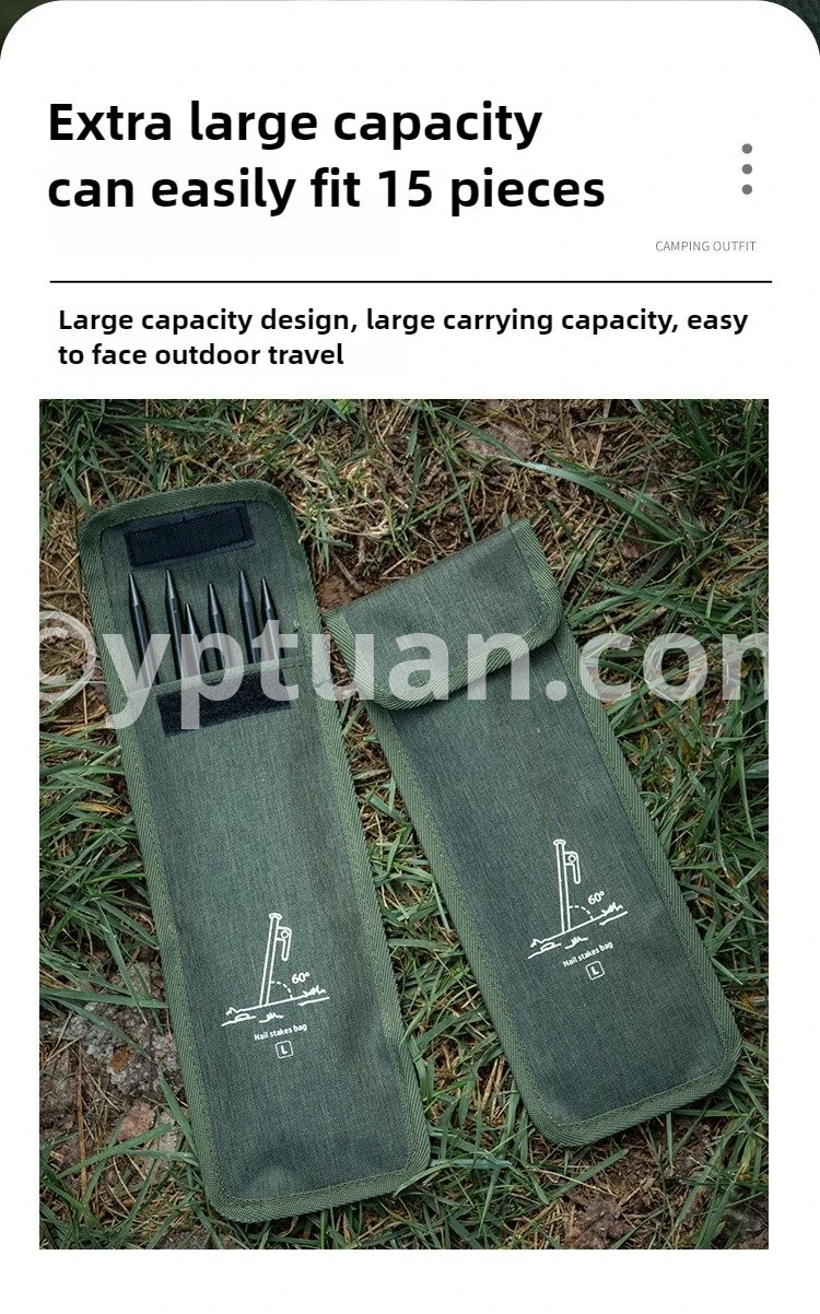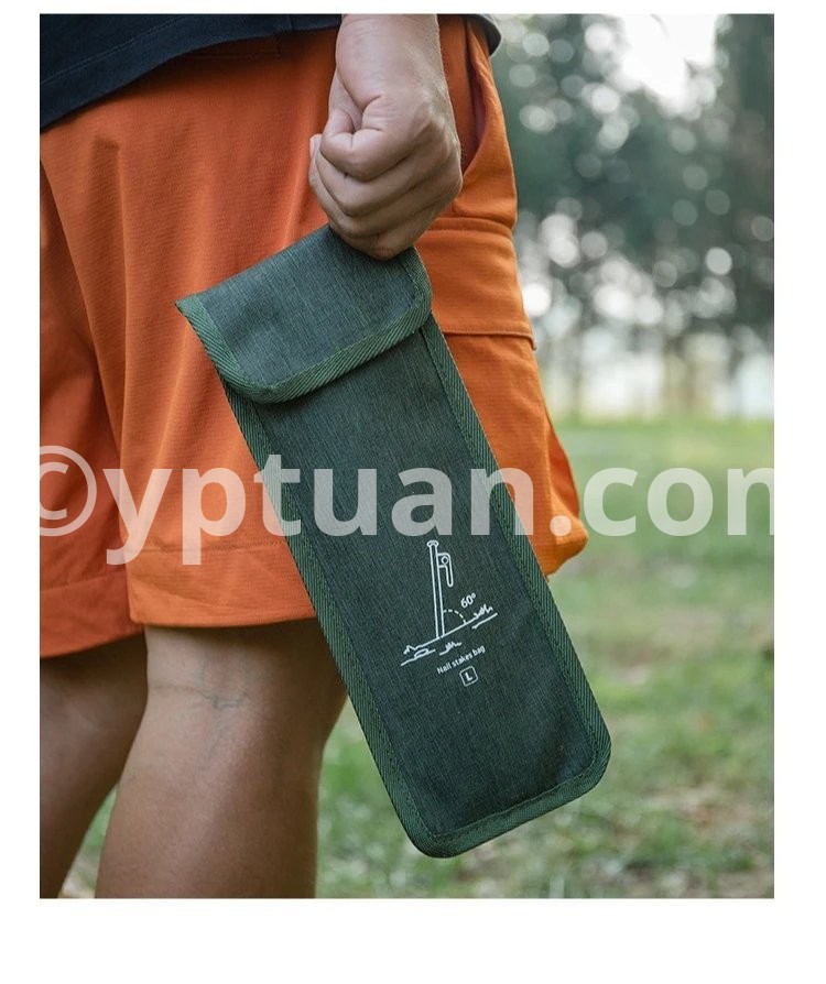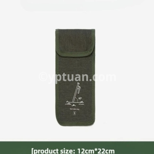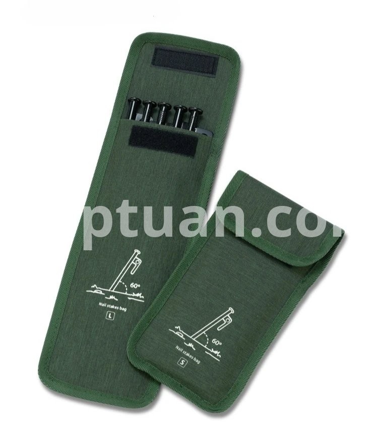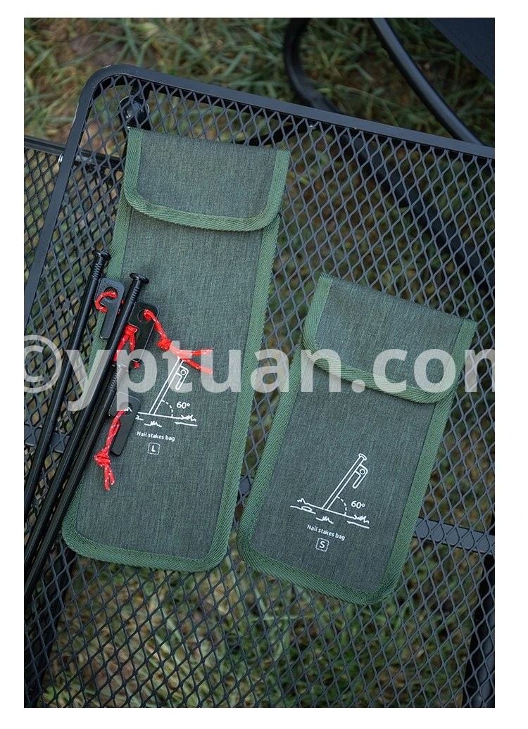 Specification: Name: outdoor tent nail bag Material: Oxford cloth Color: Green Size: 20cm-30cm Features: Outdoor nail bag is multifunctional. It can not only store and organize nails, but also has many practical functions. First of all, the ground nail package can protect the ground nail from damage, which can reduce the damage to the ground nail whether it is impact or wear. Secondly, the design of the ground nail bag is light and convenient for users to carry. Whether camping, hiking or fishing, you can carry the ground nail bag anytime and anywhere.