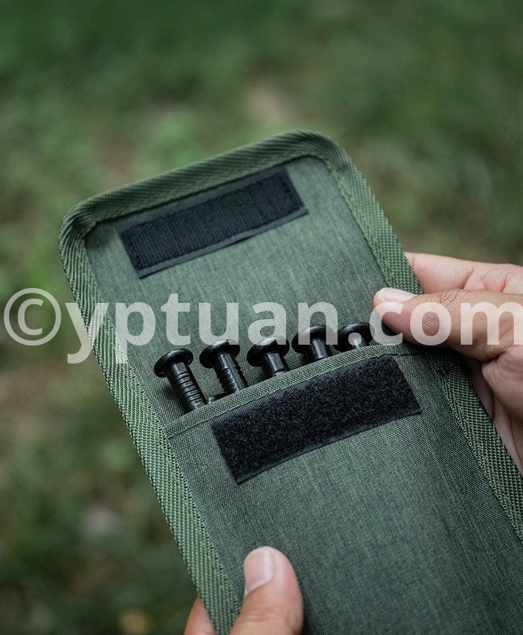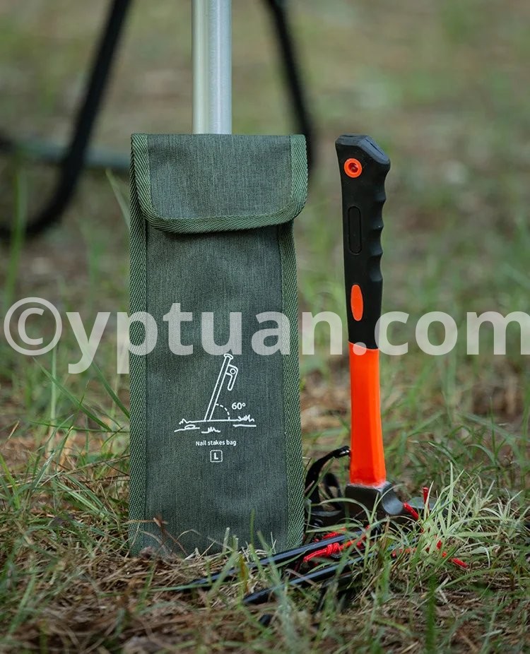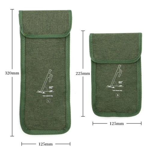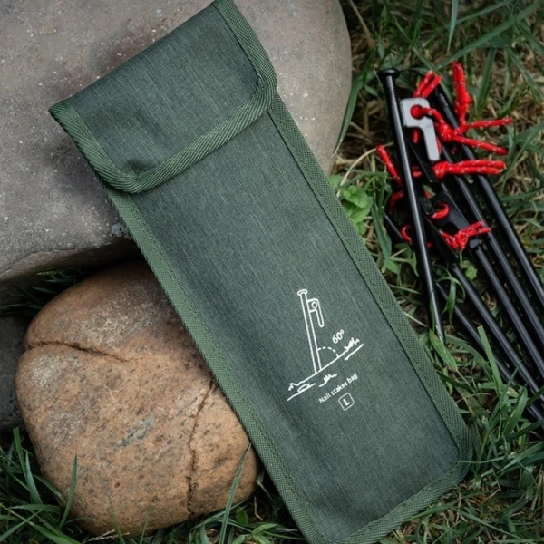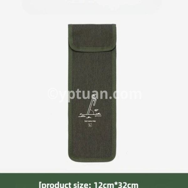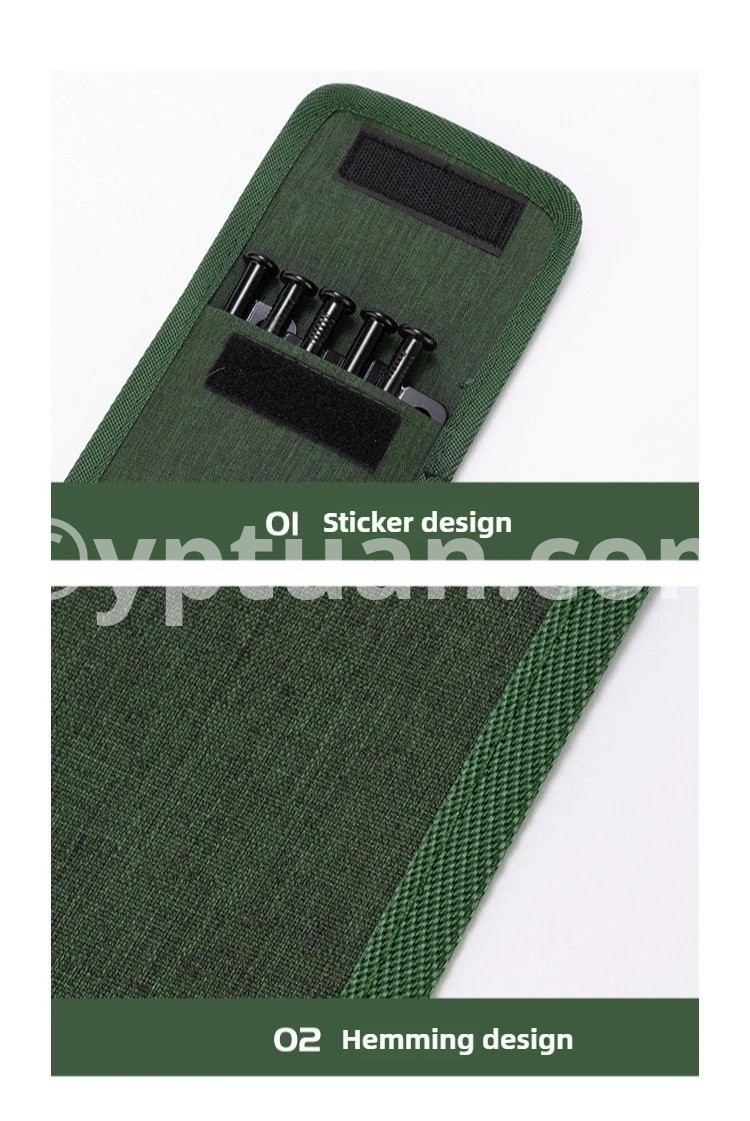 Specification: Name: outdoor tent nail bag Material: Oxford cloth Color: Green Size: 20cm-30cm Features: Outdoor nail bag is multifunctional. It can not only store and organize nails, but also has many practical functions. First of all, the ground nail package can protect the ground nail from damage, which can reduce the damage to the ground nail whether it is impact or wear. Secondly, the design of the ground nail bag is light and convenient for users to carry. Whether camping, hiking or fishing, you can carry the ground nail bag anytime and anywhere.