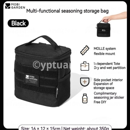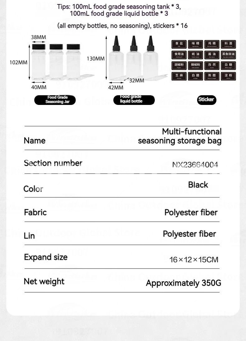 Name: Multi-functional Seasoning Storage Bag Section Number: NX23664004 Color: Black Fabric: Polyester Fiber Lin: Polyester Fiber Expand Size: 16x12x15CM Net Weight: About 350G