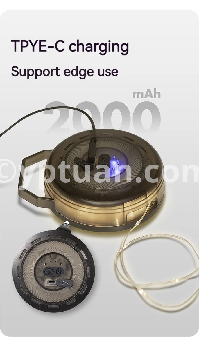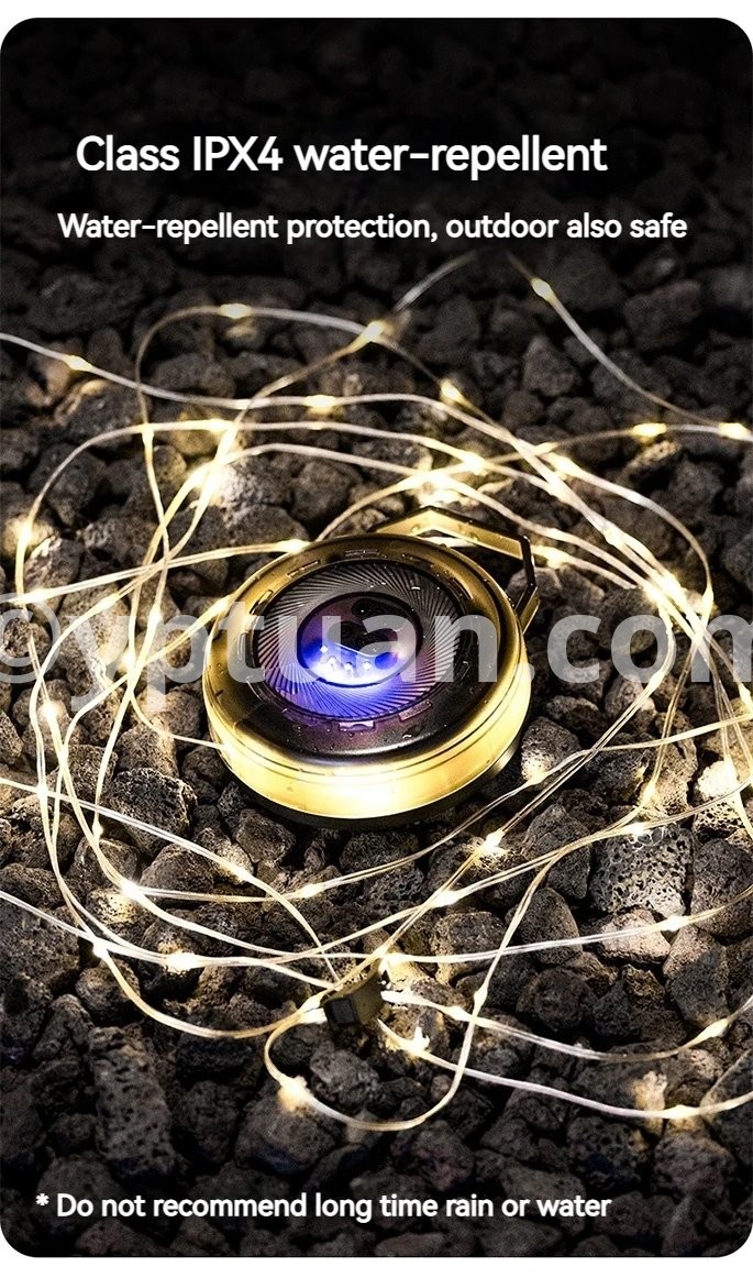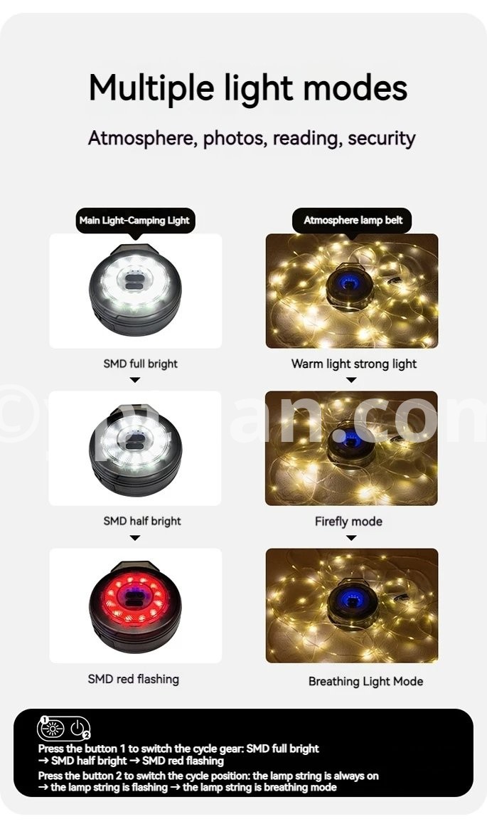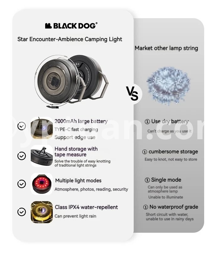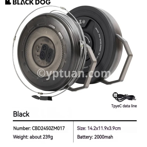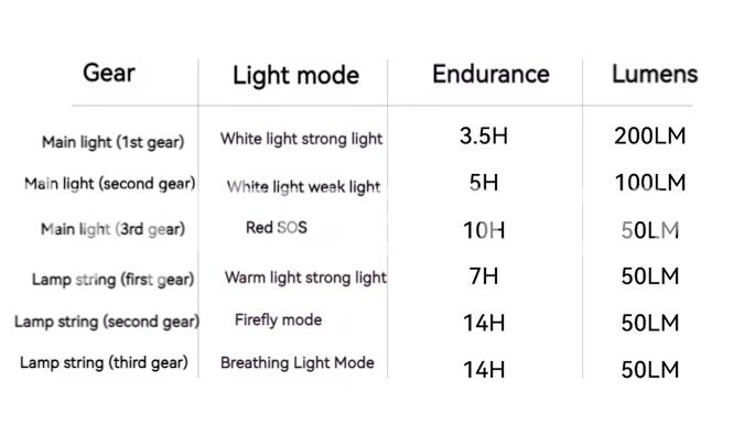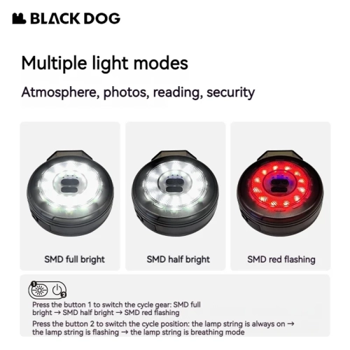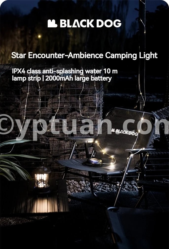 Brand: Naturehike-Blackdog Model NO.: CBD2450ZM017 Name: Star Encounter-Ambience Camping Light Color: Black Product Size: 11.9x 3.9cm (Without Handle) Battery Capacity: 2000mAH Waterproof Grade: Class IPX4 Water-repellent Weight: About 239g Material: PC ABS Rubber Paint Length of Light Strip: 10M Mode: Click: SMD Full Bright → SMD Half Bright → SMD Red Light Flashing Click: The Light String Is Always On → The Light String Is Flashing → The Light String Breathing Mode Endurance Time About: Main Lamp: First Gear 3.5H/Second Gear 5H/Third Gear 10H Lamp String: First Gear 7H/Second Gear 14H/Third Gear 14H