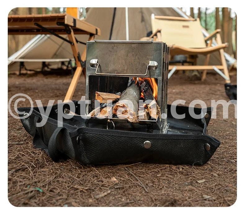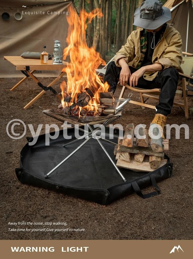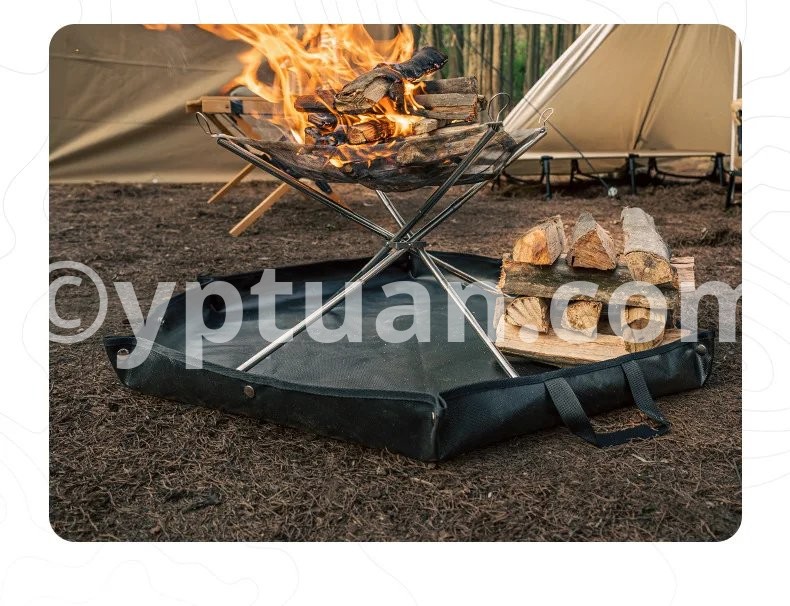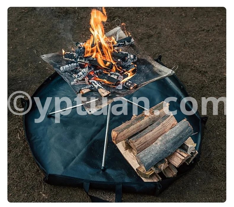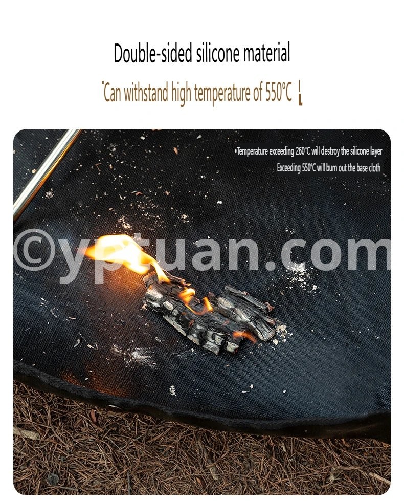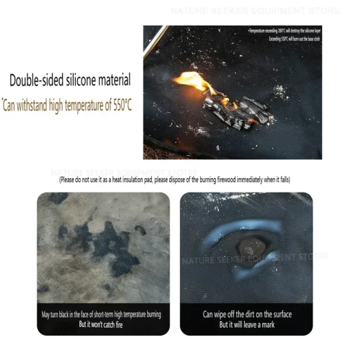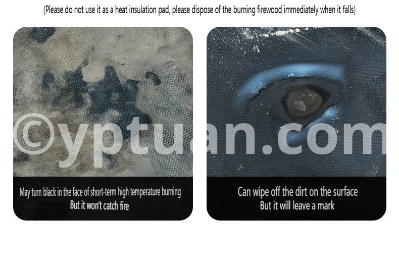 *Do not directly contact with fire, it is recommended to use it in conjunction with burning stoves and other equipment; Using fire directly or exceeding the heat-resistant temperature can cause damage and even trigger a fire (very dangerous). If any burning firewood falls onto the flame retardant pad during use, please dispose of it immediately. *Please do not use it for insulation pads or other purposes. Flame retardant pads are not insulation pads. When placing high-temperature objects on the flame retardant, heat may be transferred to the ground through the flame retardant pad. Please make sure to use it within a heat-resistant temperature range, with a heat-resistant temperature of 550 degrees (temperatures exceeding 260 degrees will break the silicone layer, and temperatures exceeding 550 degrees will burn the base fabric). The carbon fire temperature is about 600 degrees, ordinary lighters are about 500-600 degrees, and windproof lighters are about 800-1300 degrees. *For protection reasons, please do not touch sharp objects as it may cause cuts and injuries. *The burning caused by falling carbon fire or other substances can result in burn marks and discoloration on the surface of the mat. Please be aware of this and understand. *Due to the multi-purpose expansion of the product, please pay attention to the placement of the carrying strap when using it to avoid ignition. *Please confirm that the mat and surrounding fire sources are completely extinguished after use. Residual sparks may lead to reignition and even trigger a fire *Do not use corrosive substances containing acidic or alkaline substances, as they may accelerate product aging and hydrolysis deterioration.