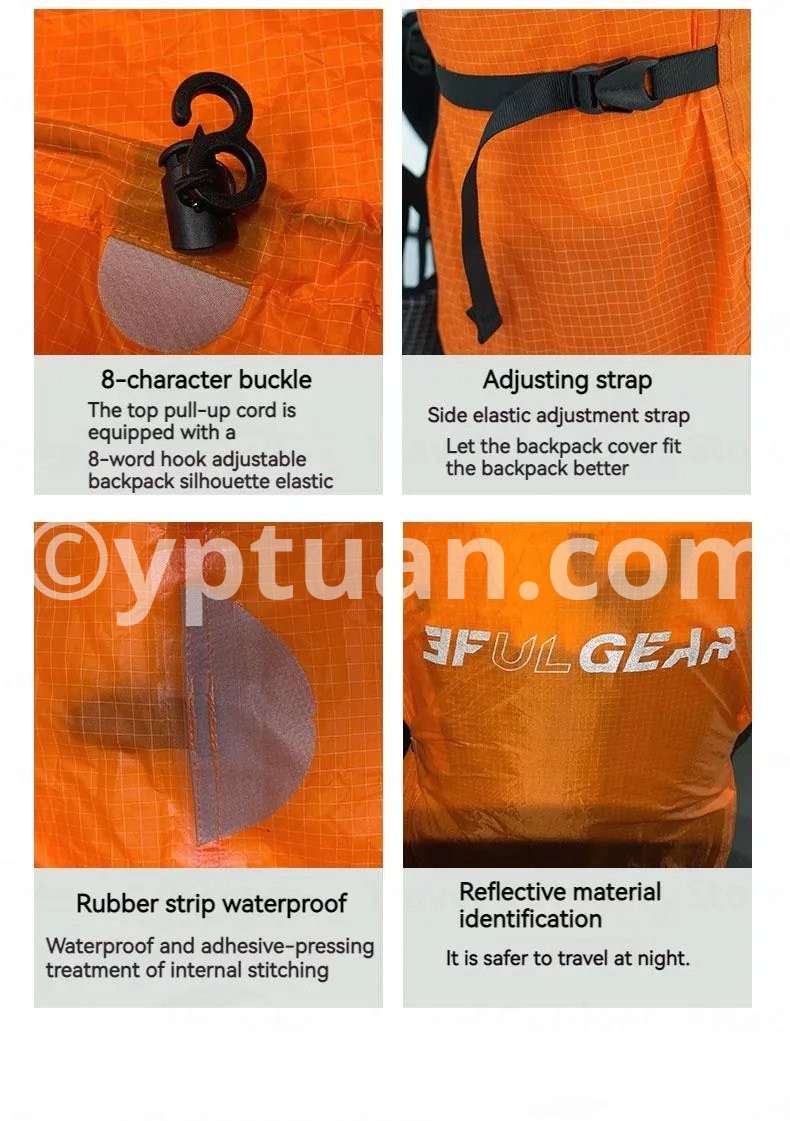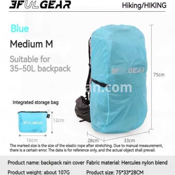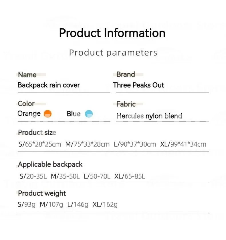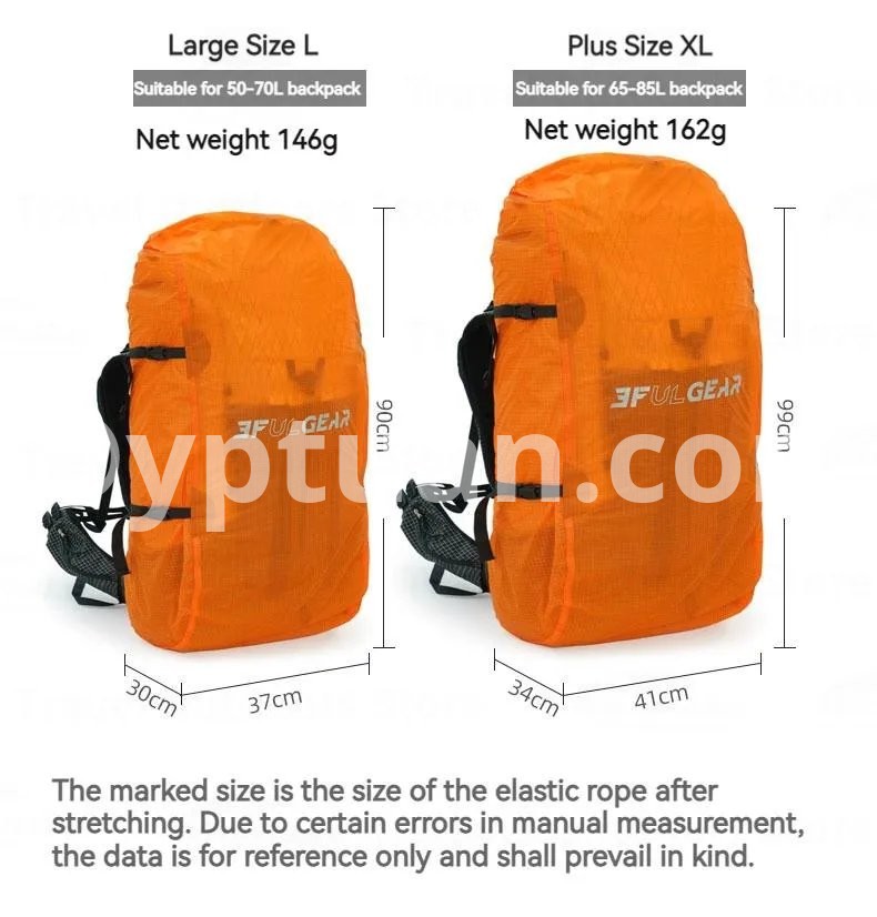 Brand: 3FUL GEAR Name: Backpack rain cover Weight: S/93g M/107g L/146g XL/162g Size: S/65*28*25cm M/75*33*28cm L/90*37*30cm XL/99*41*34cm Applicable backpack: S/20-35L M/35-50L L/50-70L XL/65-85L Fabric: Nylon Blend Color: Orange/Blue