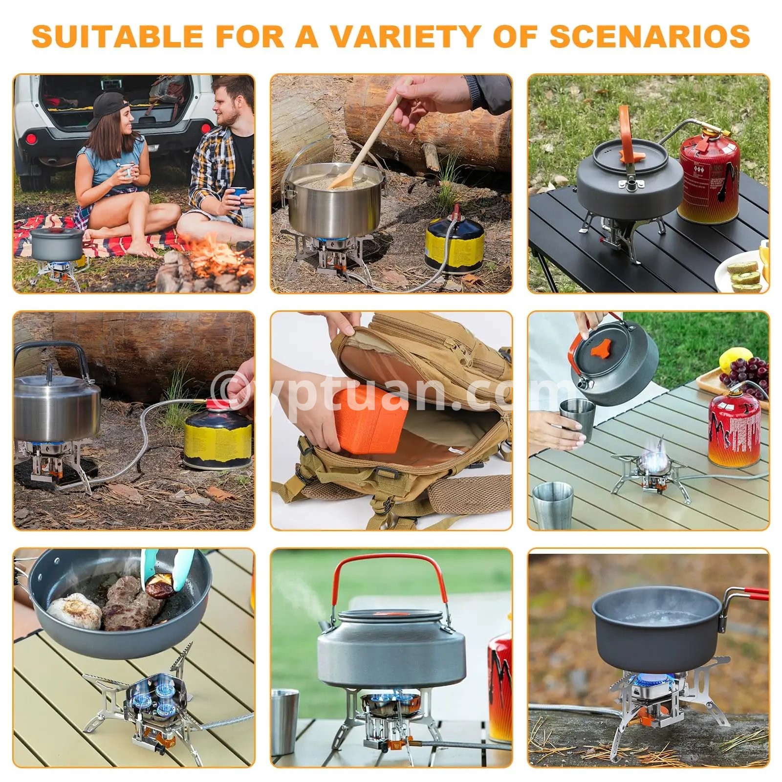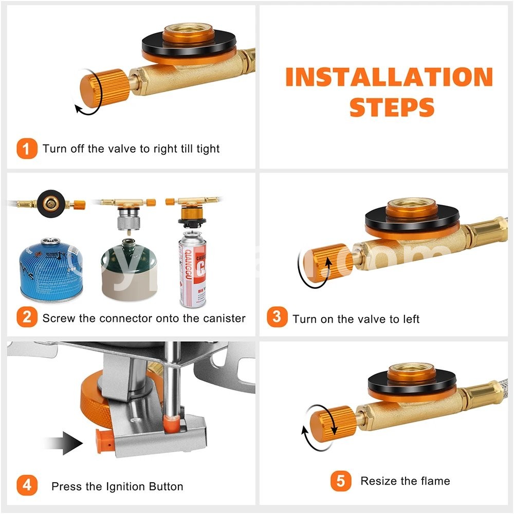 DESCRIDE: HIGH COOKING PERFORMANCE: The camping gas stove has a piezo ignition switch to ensure convenient to use. 3 honeycomb nets, 5800W super output, super firepower, fast and uniform heating, and it only takes 2-3 minutes to cook quickly. LIGHTWEIGHT AND PORTABLE GAS STOVE: Pocket rocket hiking stove weighs 11.75 ounces and is only 3.6 * 4 inches when folded. It comes with a small box for easy carrying and storage.Say goodbye to back pain, because of the ultra-light portable backpack stove. STURDY AND WINDPROOF:The folding backpacking stove has serrated support arm can stably fix your pot in place, the foldable bracket is non-slip and has strong bearing capacity. It adopts windshield design to effectively prevent wind, improve combustion efficiency and save energy. UPGRADE COPPER FURNACE CORE: Our windproof backpacking camp stove is made of high-quality stainless steel and copper, high temperature resistance, load-bearing, strong oxidation resistance, corrosion resistance, and durability. The connector parts are made of solid copper, providing a safe sealed connection to ensure leak-free operation. PERFECT CAMPING EQUIPMENT:It is the perfect camping equipment/hiking equipment/camp kitchen equipment/backpack equipment for you to start barbecue parties, picnics, outdoor cooking, traveling, hiking, fishing, snowy areas or other outdoor activities. It is also survival equipment. Product set: 1*stove + 1*gold adapter + 1*silver adapter ADAPTER DESCRIPTION: (1)The adapter that comes with the furnace is suitable for flat fuel canisters (2)The silver adapter is suitable for propane fuel canisters (3)The golden adapter is suitable for long fuel canisters