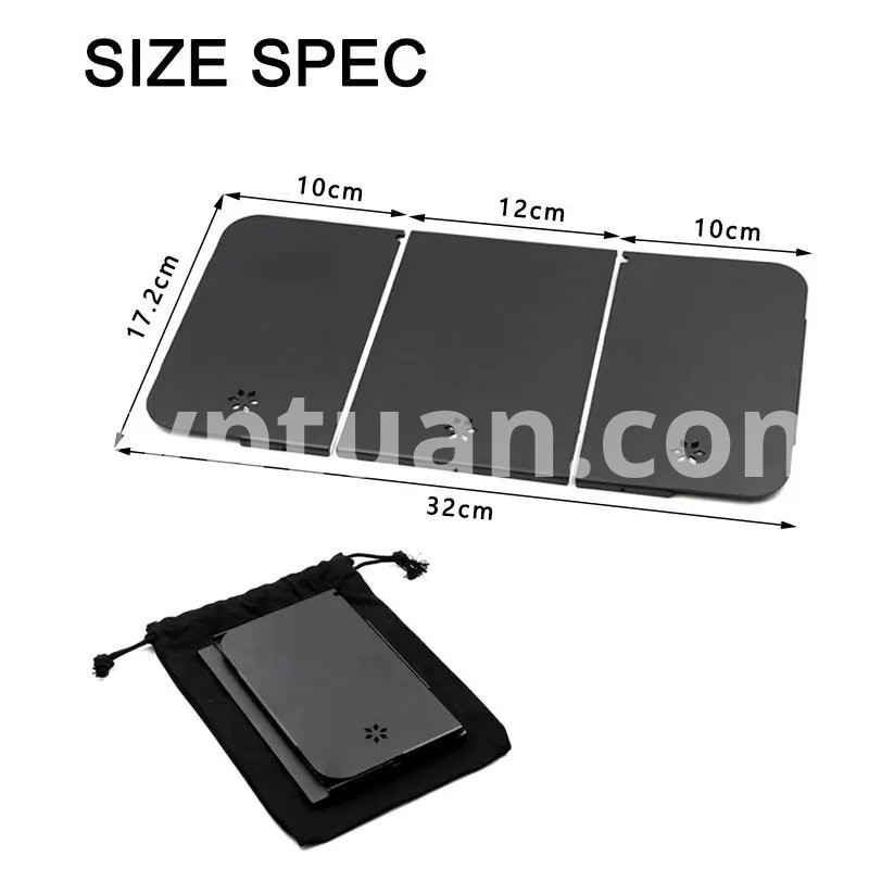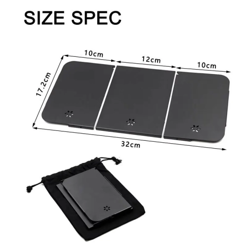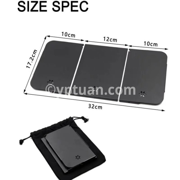 Material: aluminum alloy Thickness: about 1mm This product contains: tabletop *3. storage bag *1 Size: 32x17.2x0.5cm Weight: about 243g