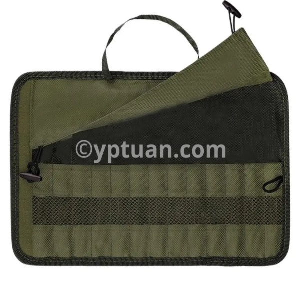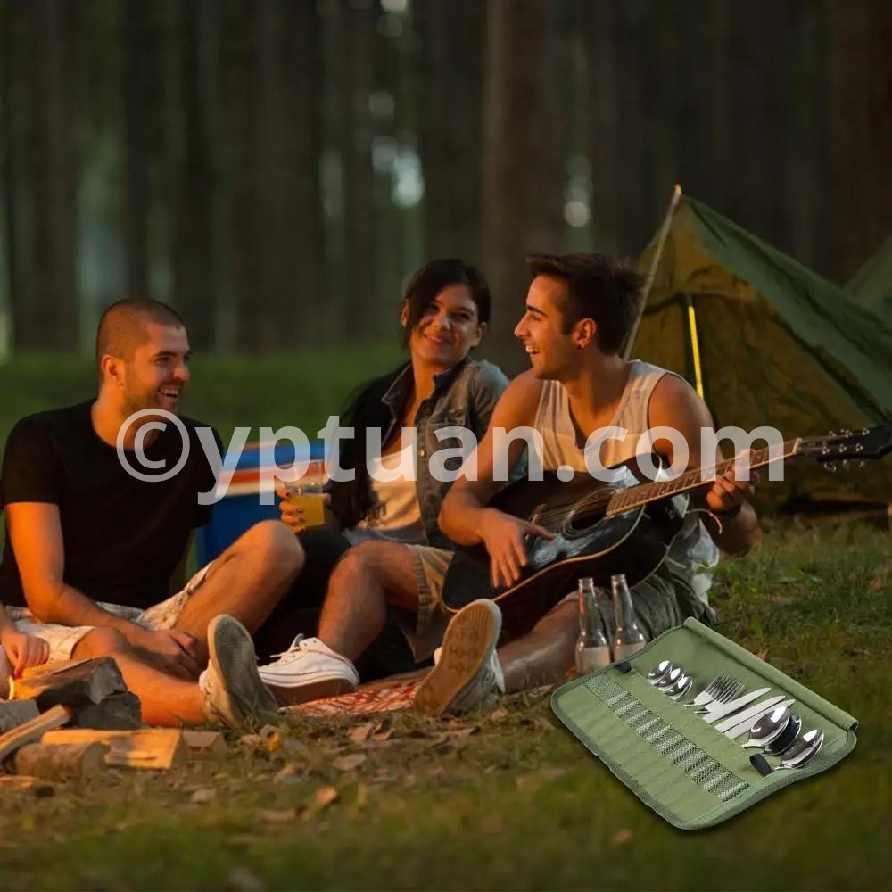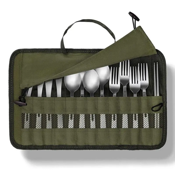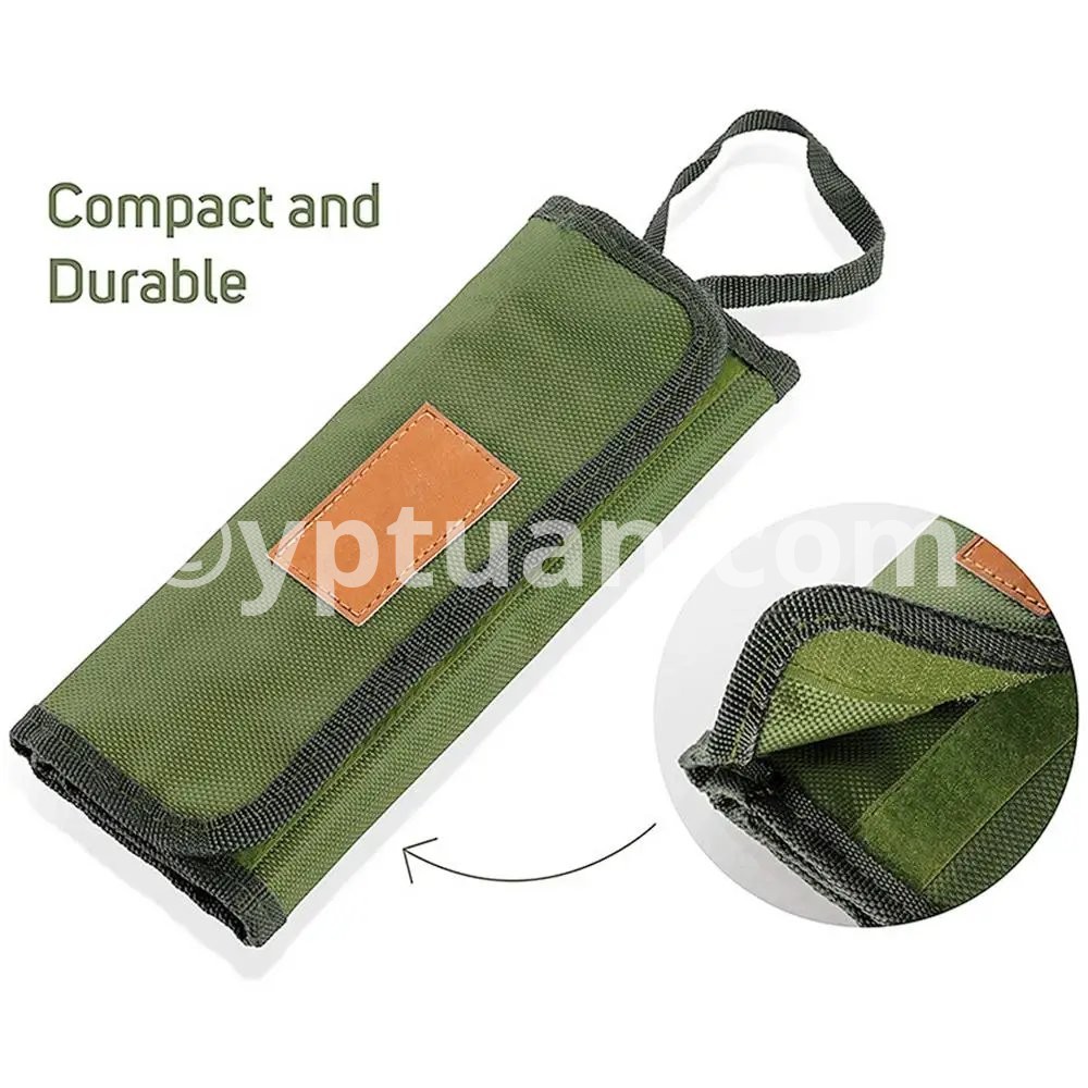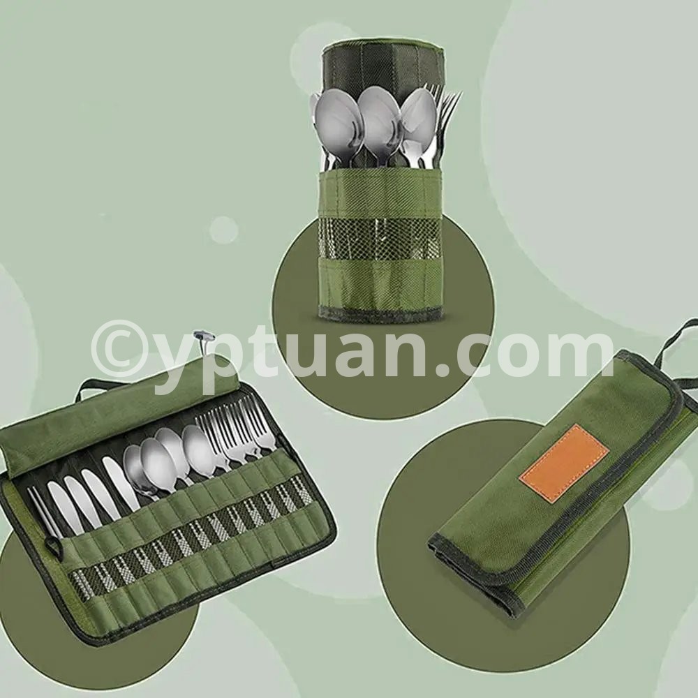 See more product details 1.Practical Protection: The cutlery storage bag can protect your cutlery from being scratched or damaged. It has multiple compartments so cutlery stays in place and doesn't click during transport. 2.Tough and Durable: Thanks to tough polyester, the portable travel tableware storage bag can protect tableware from moisture and liquids and keep them dry. 3.Easy Usage: The portable cutlery roll bag can be easily cleaned. It is about 9.5x 5 x 1inches after folded, which fits neatly in a travel suitcase, or can be hung on a backpack or be held in the hand. 4.Special Design: The camping cutlery roll bag uses an army green weave design, which can blends beautifully with tableware decor and adds a pop of color to your dinnerware no matter the occasion. 5.Widely Used: The camping tableware roll bag is suitable for your utensils organizing when your family or friends outings to the beach, park or picnic, hiking, BBQs, camping, and more.