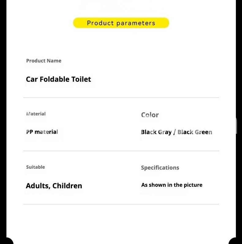 This foldable portable camping toilet is the perfect solution for outdoor adventures, car travel, road trips, and emergency use. Built from durable ABS plastic, it offers strong support and comfort for adults. Its compact design allows it to be folded flat and stored conveniently in your car, backpack, or camper without taking up space. Whether you're camping, fishing, stuck in traffic, or need an emergency toilet option—this is your go-to choice.
