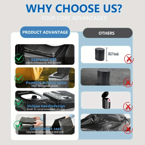 Foldable & Collapsible Design: Easily set up or fold down in seconds. Saves space and is convenient to carry and store. Strong & Durable Build: Made of high-quality ABS plastic that provides excellent stability and support for adults. Compact & Lightweight: When folded, it's only 7.9 inches tall, making it ideal for car trunks, backpacks, or camper compartments. Easy to Clean: Smooth, waterproof surface allows for hassle-free cleanup. Compatible with disposable toilet bags. Multi-Purpose Use: Suitable for camping, hiking, RV travel, boating, fishing, beach outings, traffic jams, and more.