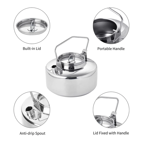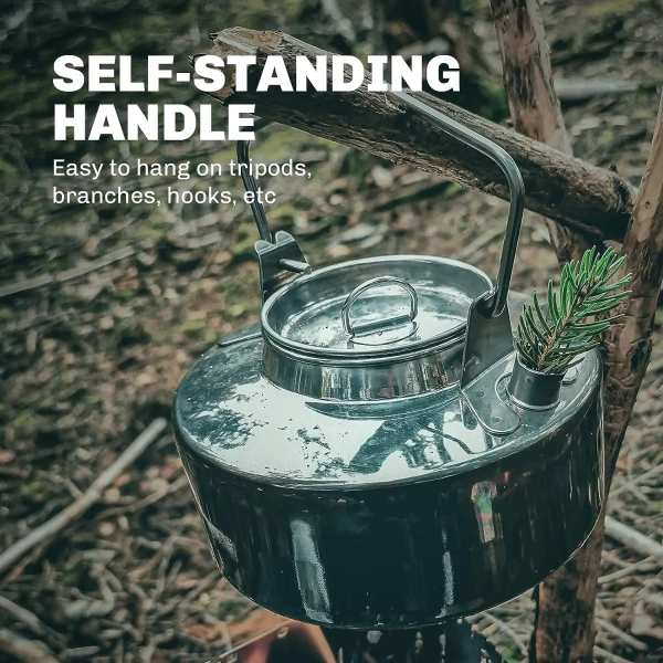 The kettle is constructed with stainless steel with a folding hangable handle for easy storage in your pack, bag, or gear shelf.