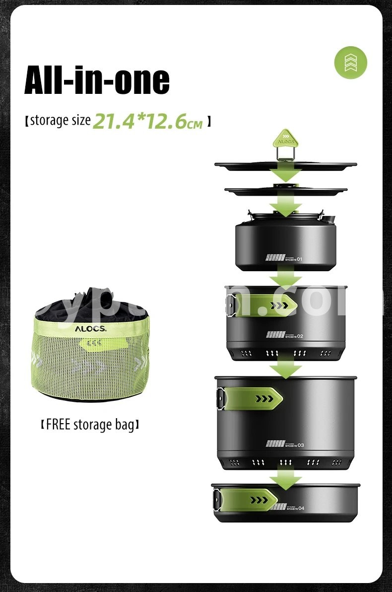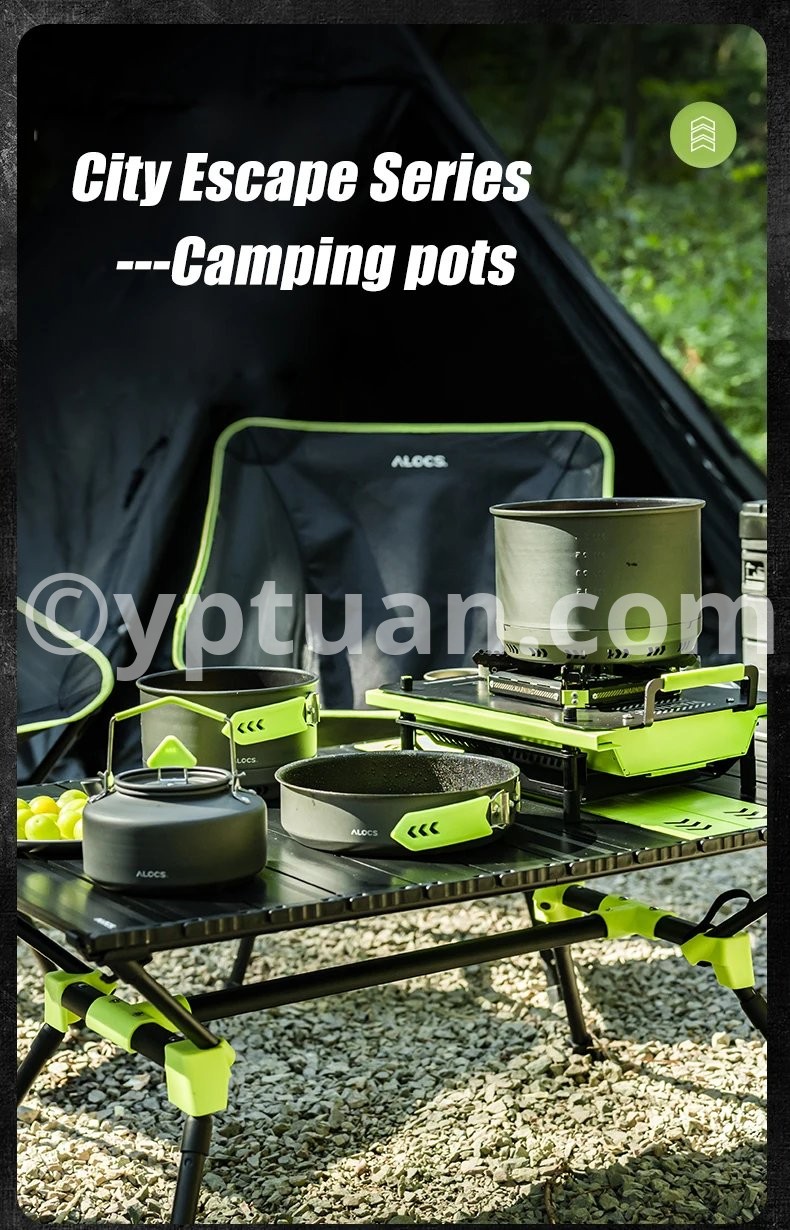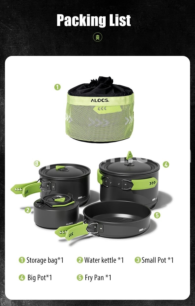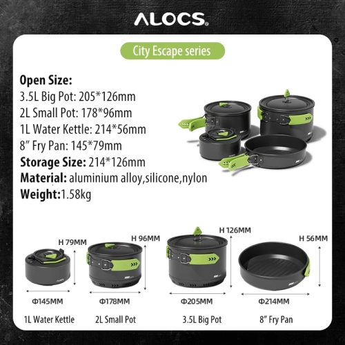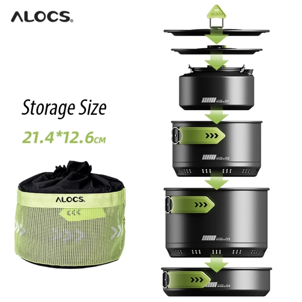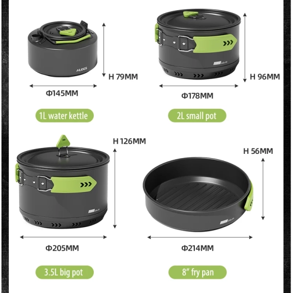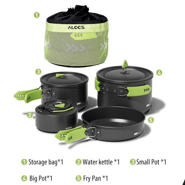 Alocs CW-C65 Camping Cookware Pots Fry Pan Water Kettle Set Compact Mess Kit Gear For Backpacking Travel Picnic Aluminum Alloy
