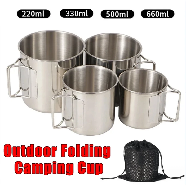 Outdoor Folding Camping Cup with Handle, Stainless Steel, Beer, Whiskey, Coffee, Tea, Milk Mugs, Water Cups, Home Backpack Hiki