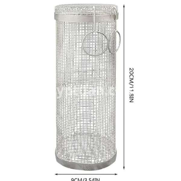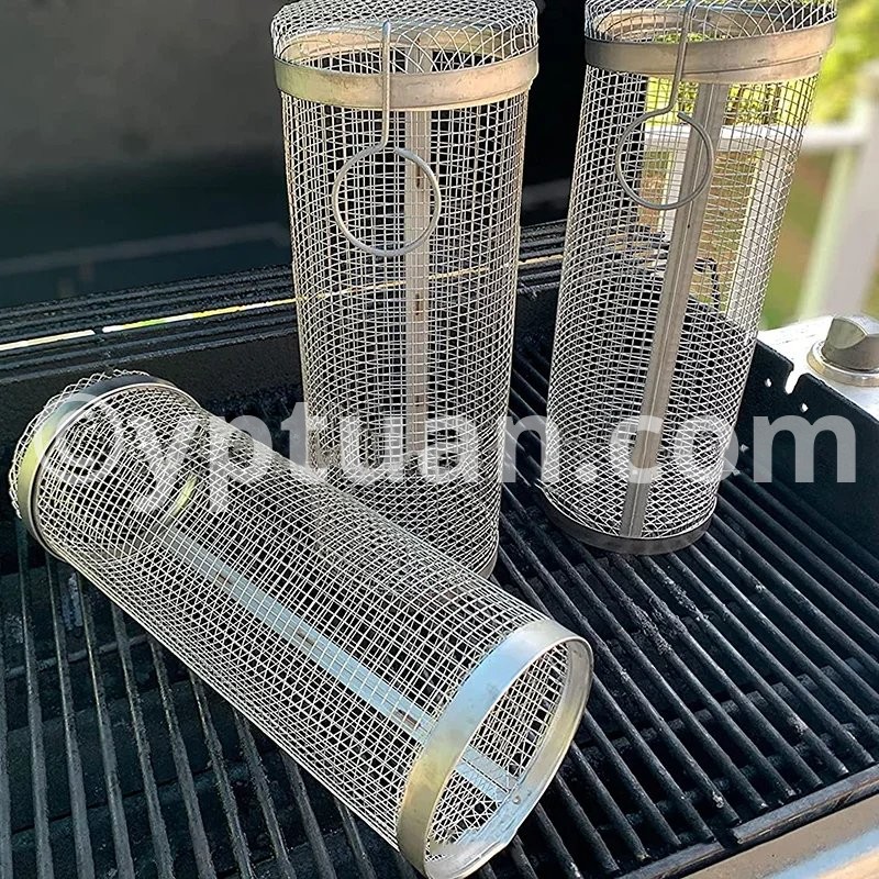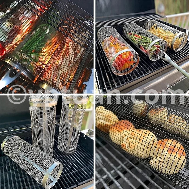 BBQ Basket Stainless Steel Rolling Grilling Basket Wire Mesh Cylinder Grill Basket Portable Round Outdoor Camping Barbecue Rack