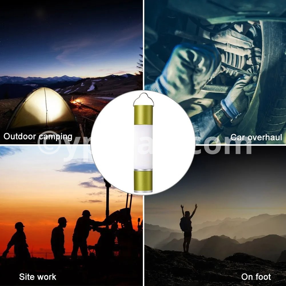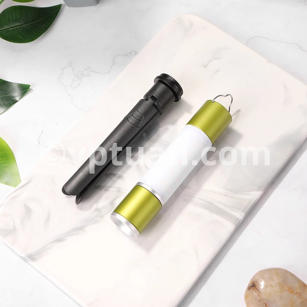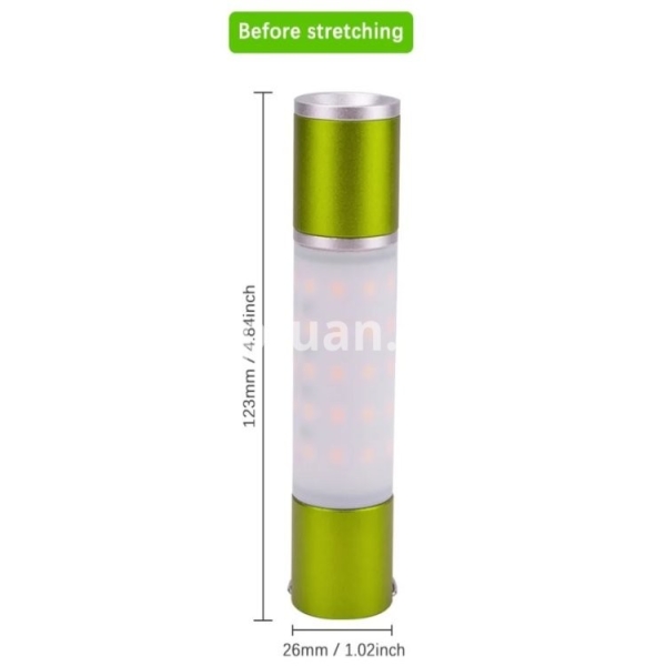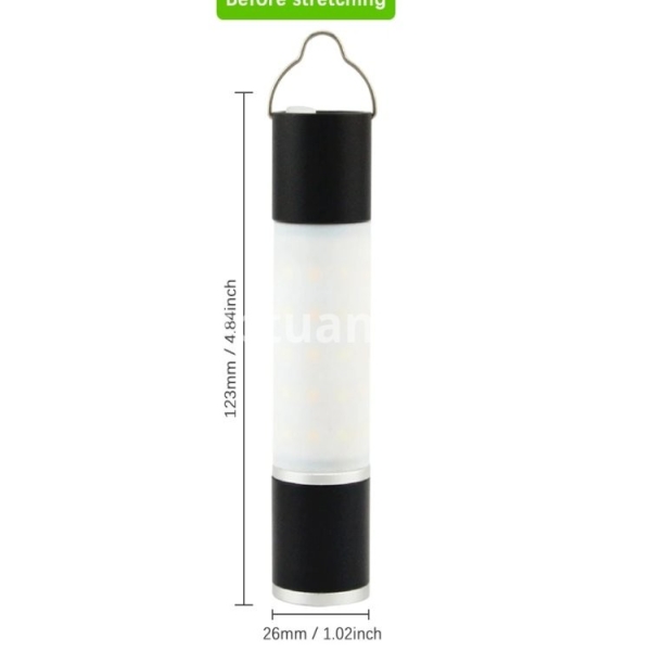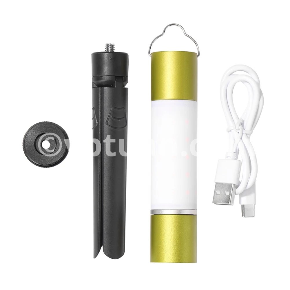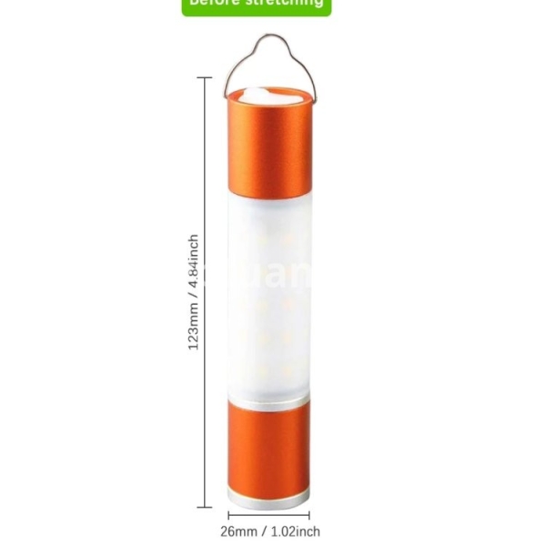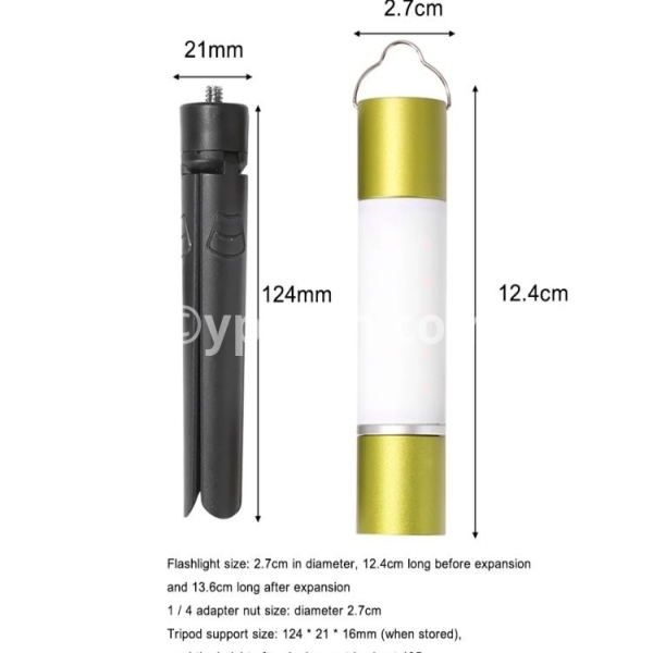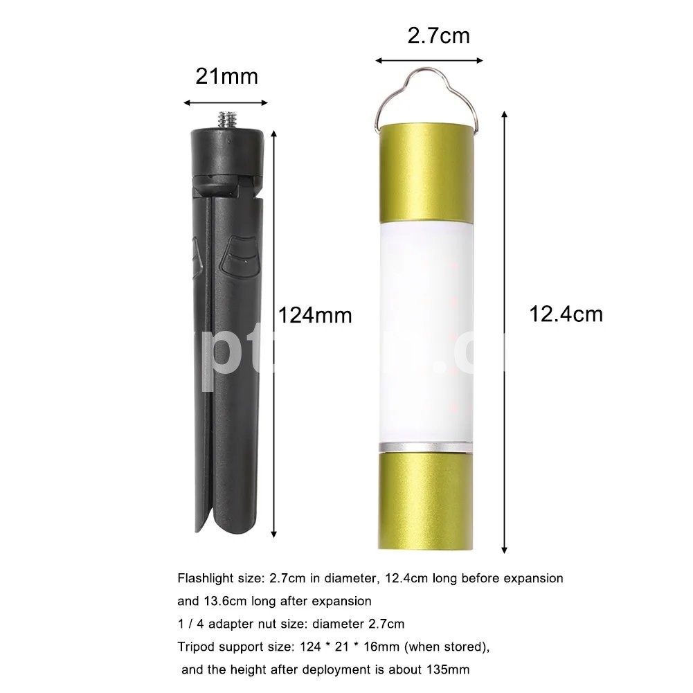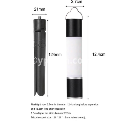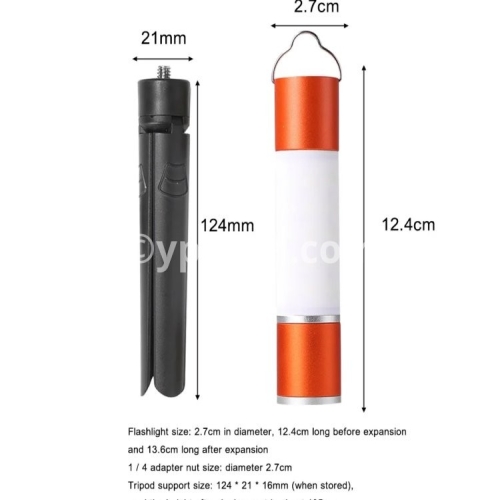 Outdoor Camping LED Telescopic Flashlight with Tripod Nuts Multifunctional Rechargeable Retractable Torch Light Table Lamp Feature: 1. Aluminum alloy material, sturdy and durable, compact and portable. 2. High brightness LED and T6 lights, with one button to control 6 lighting modes, easy to operate. 3. The focal length is adjustable, and you can zoom in / out simply by pulling the lamp holder. 4. The design of the hook ring at the top is very suitable for use as a chandelier. 5. It can be used as a table lamp, as long as the installation of transfer screws and triangle bracket, you can become a table lamp. 6. USB charging, built-in rechargeable lithium battery, which can be powered by mobile power supply or connection adapter. 7. Widely used in family, outdoor activities, hiking, night biking, fishing, camping, exploration and so on. Specification: Name: Telescopic flashlight Material: aluminum alloy + ABS Color: A: Black, B: Green, C: Orange Flashlight size: diameter: 2.7cm/1.06in, telescopic front length: 12.4cm/4.88in, telescopic rear length: 13.6cm/5.35in 1/4 adapter nut size: diameter: 2.7cm/1.06in Tripod size: 124 * 21 * 16mm/4.88*0.83*0.63in (storage), unfolded height: about 135mm/5.35in Light beads: main light T6 light beads, side lights 50 LED light beads Light color: white for the main light; white and warm yellow for the side lights Lighting mode: main light (strong / weak, scalable adjustment); side white light (strong / weak); side yellow light (strong / weak) Power supply: built-in rechargeable lithium battery Charging method: USB charging Specifications: A/B/C: Flashlight+Tripod+Nut, D: Tripod+Nut Note: Due to the different monitor and light effect, the actual color of the item might be slightly different from the color showed on the pictures. Thank you! Please allow 1-2cm measuring deviation due to manual measurement.