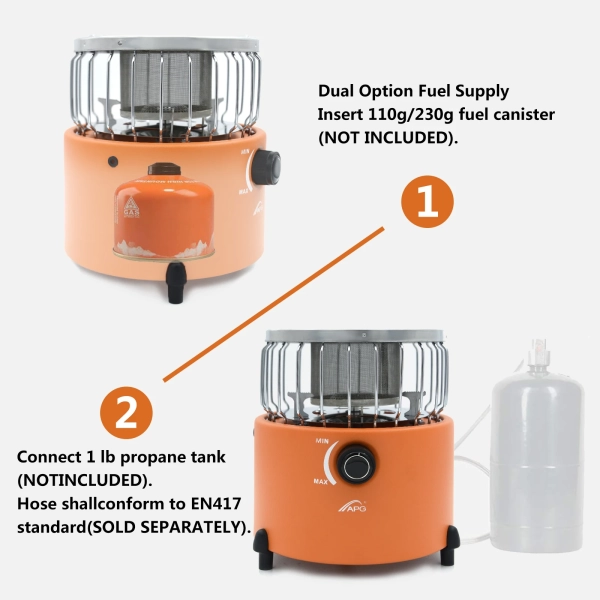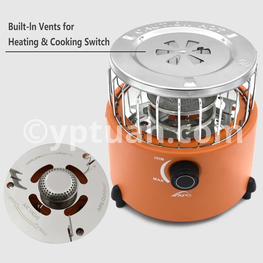 2.2 In 1 Item: Two functions heating, cooking. Can be used for all year round. Put on the heating hood, it is the heater, and if removing it, is the camping stove.